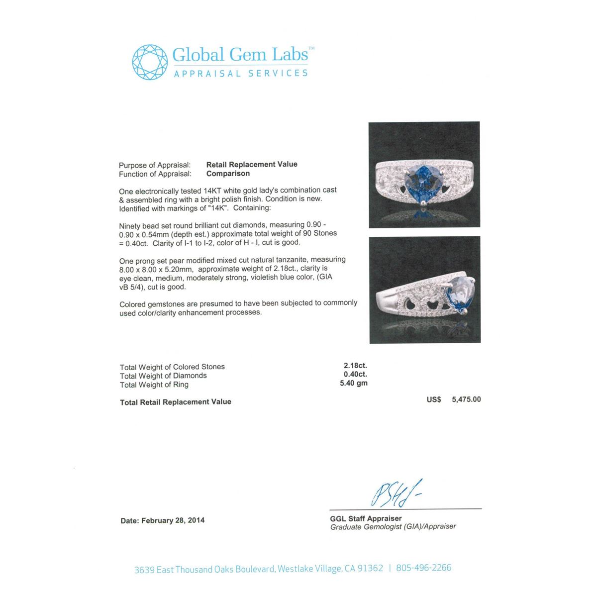 One electronically tested 14KT white gold Ladies combination cast & assembled ring with a bright polish finish. Condition is new. Identified with markings of "14K". Containing: Ninety bead set round brilliant cut diamonds, measuring 0.90 - 0.90 x 0.54mm (depth est.) approximate. Total Weight of 90 Stones = 0.40ct. Clarity: I-1 to I-2. Color: H - I, Cut is Good. One prong set pear modified mixed cut natural tanzanite, measuring 8.00 x 8.00 x 5.20mm, approximate weight of 2.18ct., clarity is eye clean, medium, moderately strong, violetish blue color, (GIA vB 5/4), cut is good. Colored gemstones are presumed to have been subjected to commonly used color/clarity enhancement processes. Total Weight of Colored Stones 2.18ct. Total Weight of Diamonds 0.40ct. Total Weight of Ring 5.40 grams. GGL Appraised at $5,475.00.