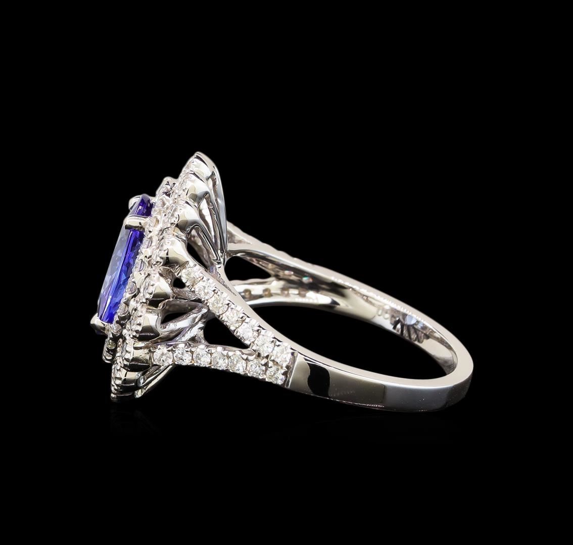 One electronically tested 14KT white gold ladies cast tanzanite and diamond ring with a split shank with a bright polish finish. Trademark is UCG. Identified with markings of "14K 585". Condition is new. Containing: One prong set oval modified brilliant cut natural tanzanite, measuring 10.04 x 7.85 x 3.93mm, approximate weight of 2.18ct., clarity is eye clean, type I, medium light, very slightly grayish, violet color, (GIA V 4/3), cut is good. Eighteen prong set round brilliant cut diamonds, measuring 1.50 - 1.50 x 0.90mm (depth est.) approximate total weight of 18 Stones = 0.22ct. Clarity: SI-2 to I-1. Color: I - J. Fifty-Two prong set round brilliant cut diamonds, measuring 1.30 - 1.30 x 0.78mm (depth est.) approximate total weight of 52 Stones = 0.42ct. Clarity: SI-2 to I-2. Color: I - J. All diamonds and colored gemstones are graded in the mounting, unless otherwise stated. Colored gemstones are presumed to have been subjected to commonly used enhancement processes.. Total Weight of Colored Stones 2.18ct. Total Weight of Diamonds 0.64ct. Total Weight of Ring 5.20 grams. GGL Appraised at $4,430.00.