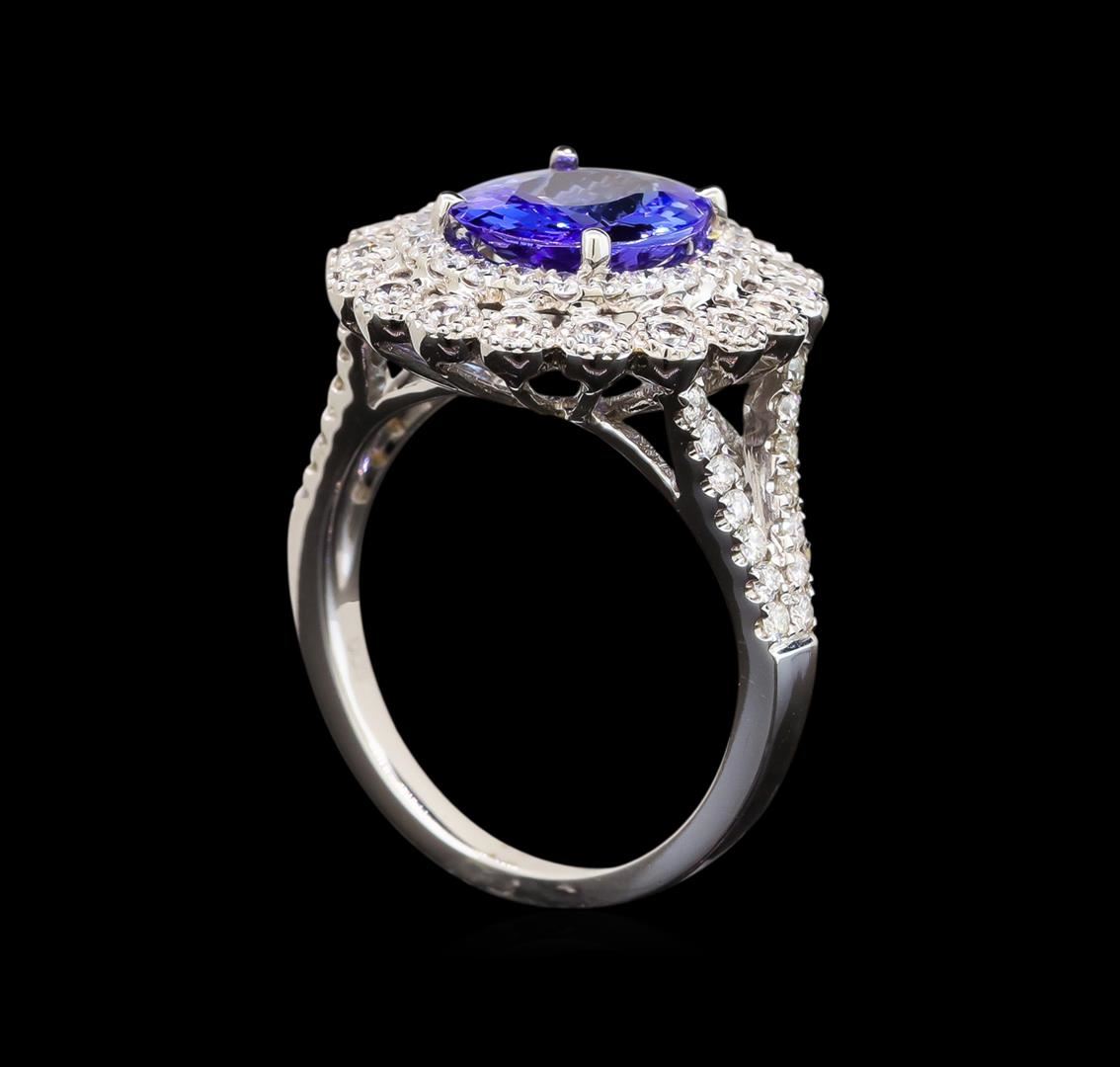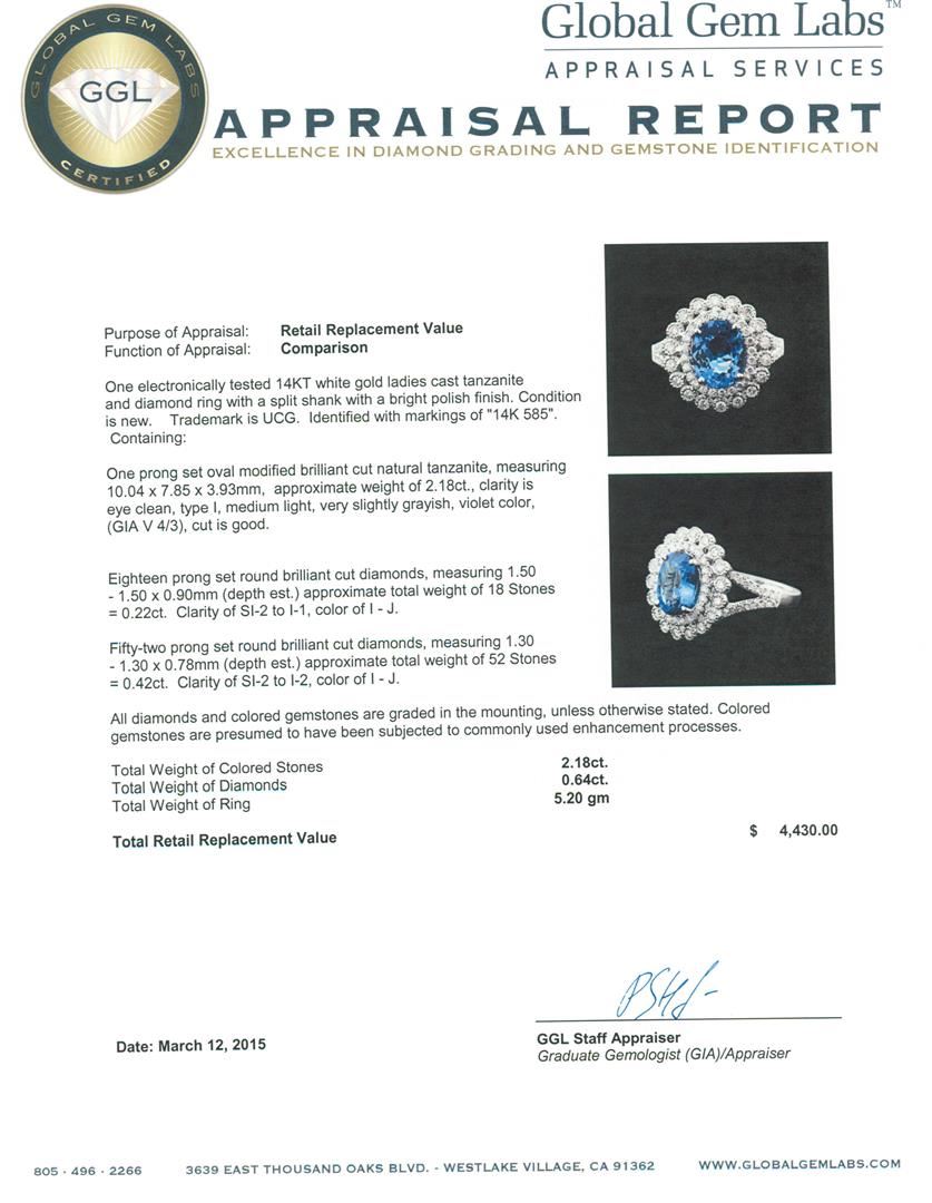One electronically tested 14KT white gold ladies cast tanzanite and diamond ring with a split shank with a bright polish finish. Trademark is UCG. Identified with markings of "14K 585". Condition is new. Containing: One prong set oval modified brilliant cut natural tanzanite, measuring 10.04 x 7.85 x 3.93mm, approximate weight of 2.18ct., clarity is eye clean, type I, medium light, very slightly grayish, violet color, (GIA V 4/3), cut is good. Eighteen prong set round brilliant cut diamonds, measuring 1.50 - 1.50 x 0.90mm (depth est.) approximate total weight of 18 Stones = 0.22ct. Clarity: SI-2 to I-1. Color: I - J. Fifty-Two prong set round brilliant cut diamonds, measuring 1.30 - 1.30 x 0.78mm (depth est.) approximate total weight of 52 Stones = 0.42ct. Clarity: SI-2 to I-2. Color: I - J. All diamonds and colored gemstones are graded in the mounting, unless otherwise stated. Colored gemstones are presumed to have been subjected to commonly used enhancement processes.. Total Weight of Colored Stones 2.18ct. Total Weight of Diamonds 0.64ct. Total Weight of Ring 5.20 grams. GGL Appraised at $4,430.00.