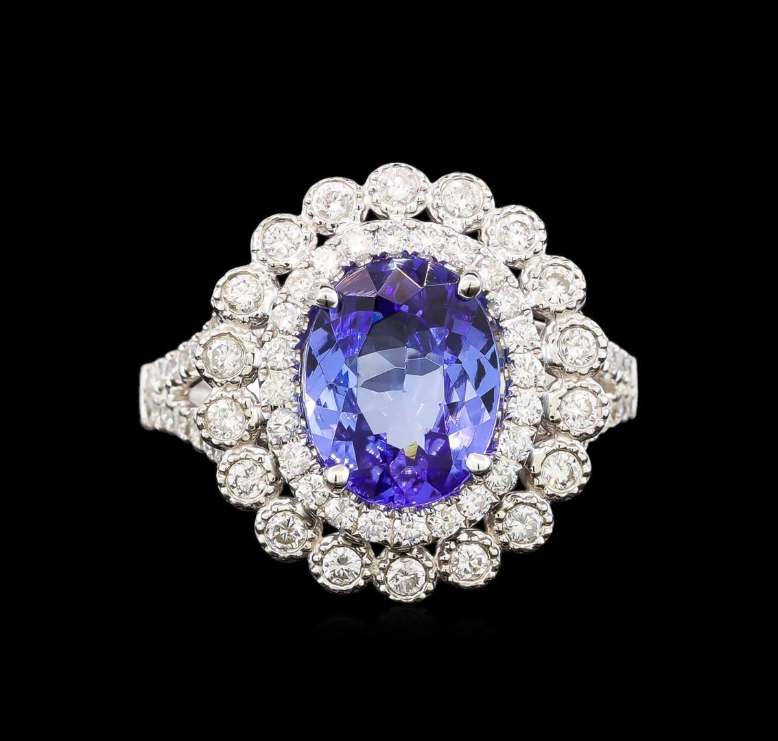 One electronically tested 14KT white gold ladies cast tanzanite and diamond ring with a split shank with a bright polish finish. Trademark is UCG. Identified with markings of "14K 585". Condition is new. Containing: One prong set oval modified brilliant cut natural tanzanite, measuring 10.04 x 7.85 x 3.93mm, approximate weight of 2.18ct., clarity is eye clean, type I, medium light, very slightly grayish, violet color, (GIA V 4/3), cut is good. Eighteen prong set round brilliant cut diamonds, measuring 1.50 - 1.50 x 0.90mm (depth est.) approximate total weight of 18 Stones = 0.22ct. Clarity: SI-2 to I-1. Color: I - J. Fifty-Two prong set round brilliant cut diamonds, measuring 1.30 - 1.30 x 0.78mm (depth est.) approximate total weight of 52 Stones = 0.42ct. Clarity: SI-2 to I-2. Color: I - J. All diamonds and colored gemstones are graded in the mounting, unless otherwise stated. Colored gemstones are presumed to have been subjected to commonly used enhancement processes.. Total Weight of Colored Stones 2.18ct. Total Weight of Diamonds 0.64ct. Total Weight of Ring 5.20 grams. GGL Appraised at $4,430.00.