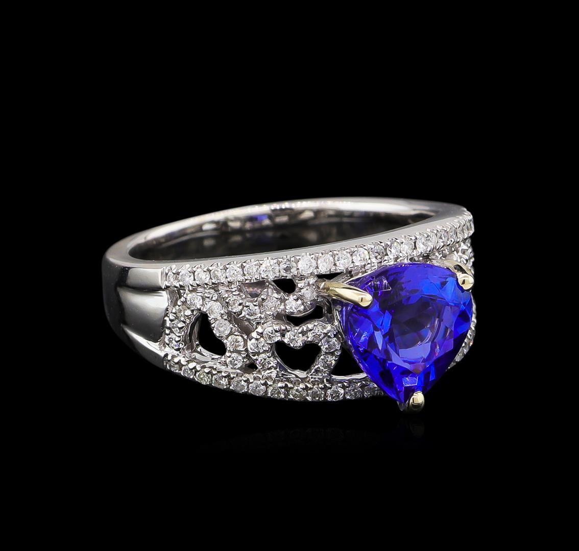 One electronically tested 14KT white gold Ladies combination cast & assembled ring with a bright polish finish. Condition is new. Identified with markings of "14K". Containing: Ninety bead set round brilliant cut diamonds, measuring 0.90 - 0.90 x 0.54mm (depth est.) approximate. Total Weight of 90 Stones = 0.40 ct. Clarity: I-1 to I-2. Color: H - I, Cut is Good. One prong set pear modified mixed cut natural tanzanite, measuring 8.00 x 8.00 x 5.20mm, approximate weight of 2.18ct., clarity is eye clean, medium, moderately strong, violetish blue color, (GIA vB 5/4), cut is good. Colored gemstones are presumed to have been subjected to commonly used color/clarity enhancement processes. Total Weight of Colored Stones 2.18ct. Total Weight of Diamonds 0.40 ct. Total Weight of Ring 5.40 grams. GGL Appraised.