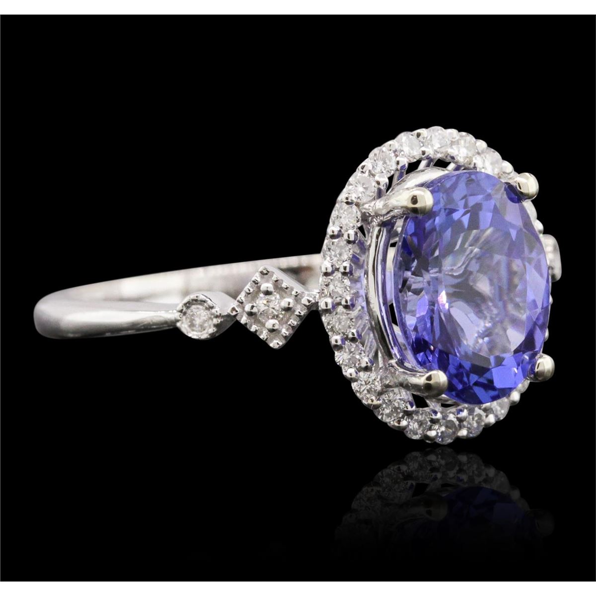 One electronically tested 14KT white gold ladies cast tanzanite and diamond ring. Condition is new, good workmanship. The featured tanzanite is set within a diamond bezel supported by diamond accented shoulders, completed by a two millimeter wide band. Bright polish finish with milgrain detailing. Identified with markings of "14K". Containing: One prong set oval brilliant cut natural tanzanite, measuring 9.05 x 7.10 x 4.70mm, 6%. bulge factor, approximate weight of 2.18ct., clarity is eye clean, type I, medium dark, moderately strong, bluish violet color, (GIA bV 6/4), cut is good. Transmitting light with no distortion, transparent. Graded in the setting. Tanzanite is a very rare gemstone that is only found in the country of Tanzania. Originally discovered in 1967. Tiffany & Company, named the stone Tanzanite. It is found in the Usumburu Mountains that border the Umba Valley of northern Tanzania. Tanzanite occurs in gray, brown, violet, blue, reddish-purple, & green. The gem is interesting because of its exceptional pleochroism. Rotated in different directions a tanzanite will exhibit multiple changes of color. Tanzanite has a low tolerance to ultrasonic cleaning, and should not be cleaned using this method. Twenty-Eight prong and bezel set round brilliant cut diamonds, measuring 1.20 - 1.10 x 0.69mm (depth est.) approximate. Total Weight of 28 Stones = 0.24ct. Graded in the setting. Clarity: SI-1 to I-1. Color: H - J. Total Weight of Colored Stones 2.18ct. Total Weight of Diamonds 0.24ct. Total Weight of Ring 3.04 grams. AIG Appraised at $6,450.00.