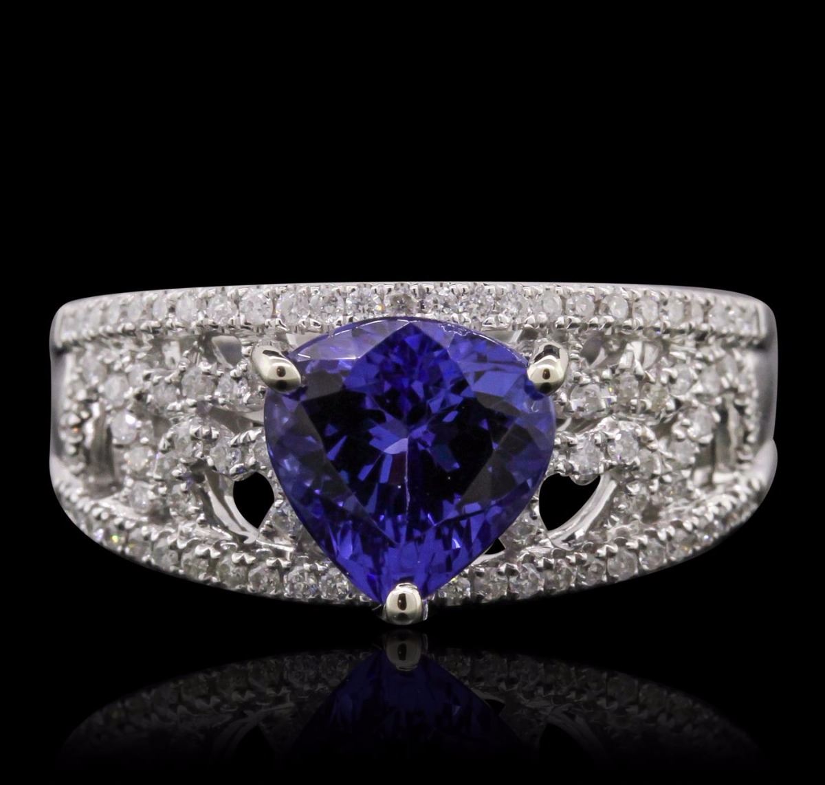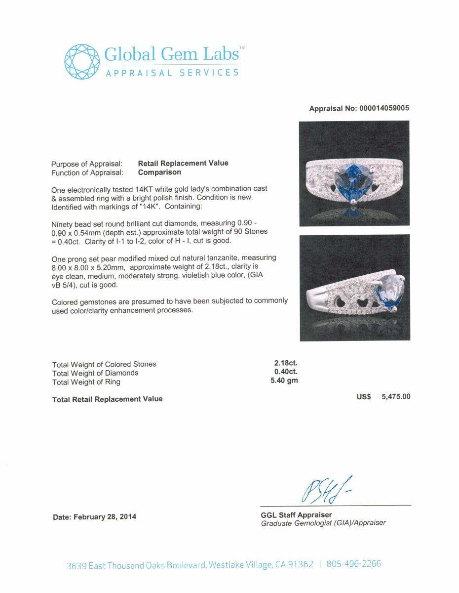 One electronically tested 14KT white gold Ladies combination cast & assembled ring with a bright polish finish. Condition is new. Identified with markings of "14K". Containing: Ninety bead set round brilliant cut diamonds, measuring 0.90 - 0.90 x 0.54mm (depth est.) approximate. Total Weight of 90 Stones = 0.40ct. Clarity: I-1 to I-2. Color: H - I, Cut is Good. One prong set pear modified mixed cut natural tanzanite, measuring 8.00 x 8.00 x 5.20mm, approximate weight of 2.18ct., clarity is eye clean, medium, moderately strong, violetish blue color, (GIA vB 5/4), cut is good. Colored gemstones are presumed to have been subjected to commonly used color/clarity enhancement processes. Total Weight of Colored Stones 2.18ct. Total Weight of Diamonds 0.40ct. Total Weight of Ring 5.40 grams. GGL Appraised at $5,475.00.