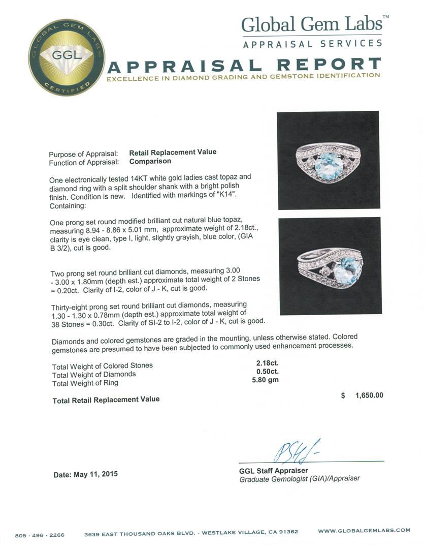 One electronically tested 14KT white gold ladies cast topaz and diamond ring with a split shoulder shank with a bright polish finish. Identified with markings of "K14". Condition is new. Containing: One prong set round modified brilliant cut natural blue topaz, measuring 8.94 - 8.86 x 5.01 mm, approximate weight of 2.18ct., clarity is eye clean, type I, light, slightly grayish, blue color, (GIA B 3/2), cut is good. Two prong set round brilliant cut diamonds, measuring 3.00 - 3.00 x 1.80mm (depth est.) approximate total weight of 2 Stones = 0.20ct. Clarity: I-2. Color: J - K, Cut is Good. Thirty-Eight prong set round brilliant cut diamonds, measuring 1.30 - 1.30 x 0.78mm (depth est.) approximate total weight of 38 Stones = 0.30ct. Clarity: SI-2 to I-2. Color: J - K, Cut is Good. Diamonds and colored gemstones are graded in the mounting, unless otherwise stated. Colored gemstones are presumed to have been subjected to commonly used enhancement processes. Total Weight of Colored Stones 2.18ct. Total Weight of Diamonds 0.50ct. Total Weight of Ring 5.80 grams. GGL Appraised at $1,650.00.