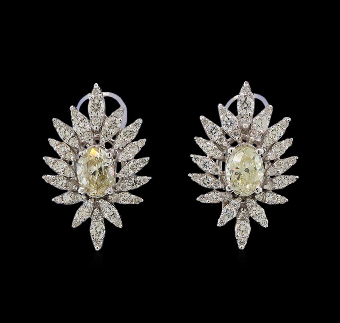 One pair electronically tested 14KT white gold ladies cast diamond earrings with Omega clip backs with a bright polish finish. Condition is new. Containing: Two prong set oval shaped cut diamonds, measuring 6.50 x 4.00 x 2.90mm (depth est.) approximate total weight of 2 Stones = 0.99ct. Clarity: SI-1 to SI-2. Color: L - M, Cut is Good. Ninety-Six prong set round brilliant cut diamonds, measuring 2.10 - 1.20 x 0.99mm (depth est.) approximate total weight of 96 Stones = 1.20ct. Clarity: SI-1 to SI-2. Color: I - J, Cut is Good. All diamonds are graded in the mounting, unless otherwise stated. Total Weight of Diamonds 2.19ct. Total Weight of Earrings 7.20 grams. GGL Appraised at $6,115.00.