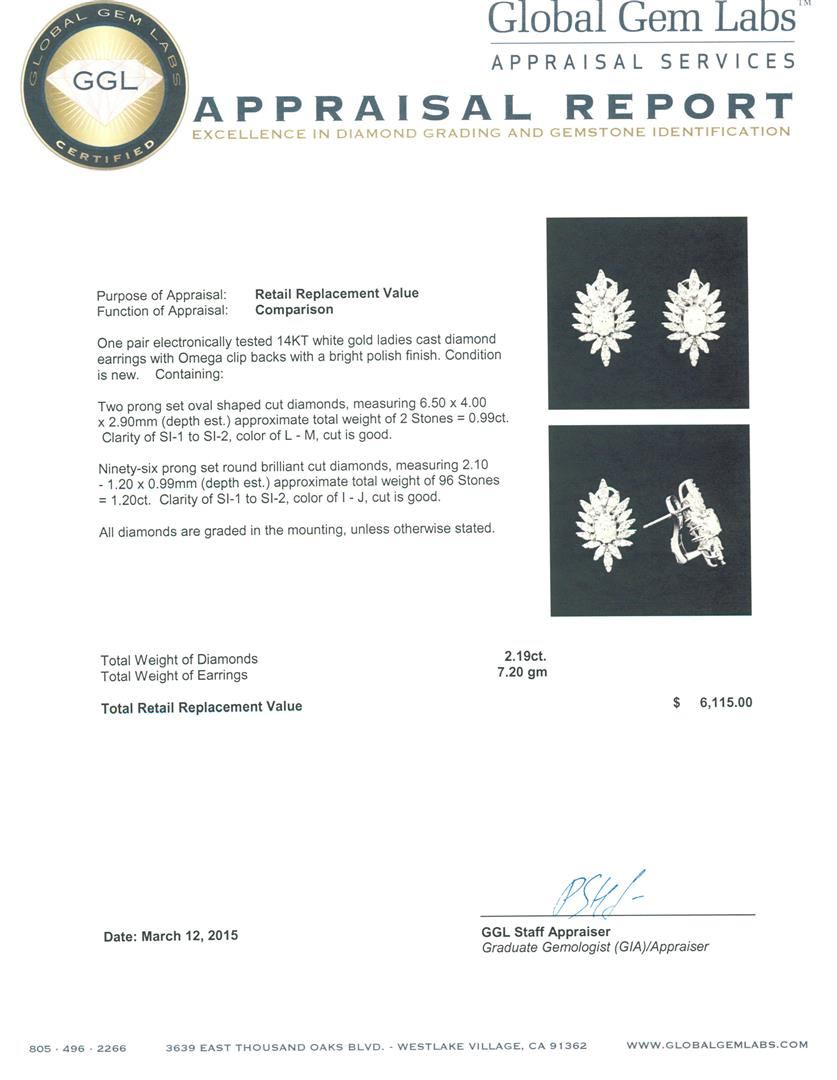 One pair electronically tested 14KT white gold ladies cast diamond earrings with Omega clip backs with a bright polish finish. Condition is new. Containing: Two prong set oval shaped cut diamonds, measuring 6.50 x 4.00 x 2.90mm (depth est.) approximate total weight of 2 Stones = 0.99ct. Clarity: SI-1 to SI-2. Color: L - M, Cut is Good. Ninety-Six prong set round brilliant cut diamonds, measuring 2.10 - 1.20 x 0.99mm (depth est.) approximate total weight of 96 Stones = 1.20ct. Clarity: SI-1 to SI-2. Color: I - J, Cut is Good. All diamonds are graded in the mounting, unless otherwise stated. Total Weight of Diamonds 2.19ct. Total Weight of Earrings 7.20 grams. GGL Appraised at $6,115.00.
