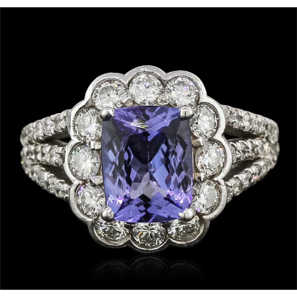 One electronically tested 14KT white gold ladies combination cast & assembled tanzanite and diamond ring with a bright polish finish. Identified with markings of "14K". Condition is new. Containing: One prong set rectangular cushion modified brilliant cut natural tanzanite, measuring 8.65 x 7.03 x 4.57mm, approximate weight of 2.19ct., clarity is eye clean, type I, medium light, very slightly grayish, violet color, (GIA V 4/3), cut is good. Fifty prong set round brilliant cut diamonds, measuring 1.30 - 1.30 x 0.78mm (depth est.) approximate total weight of 50 Stones = 0.40ct. Clarity: SI-2 to I-1. Color: I - J, Cut is Good. Twelve prong set round brilliant cut diamonds, measuring 2.50 - 2.50 x 1.50mm (depth est.) approximate total weight of 12 Stones = 0.69ct. Clarity: SI-1 to SI-2. Color: H - I, Cut is Good. Colored gemstones are presumed to have been subjected to commonly used enhancement processes. All diamonds and colored gemstones are graded in the mounting, unless otherwise stated. Total Weight of Colored Stones 2.19ct. Total Weight of Diamonds 1.09ct. Total Weight of Ring 5.80 grams. GGL Appraised at $5,460.00.