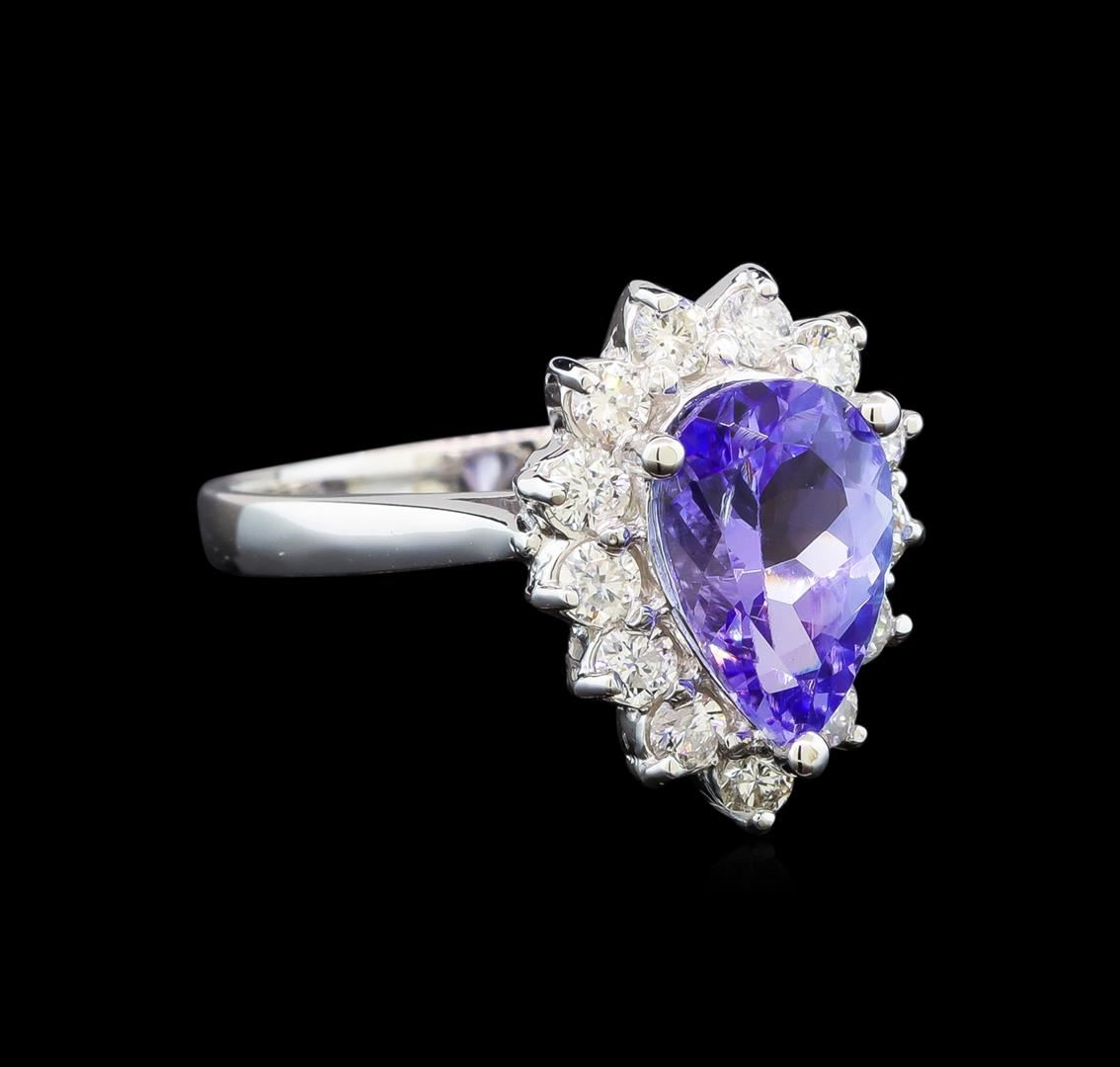 One electronically tested 14KT white gold ladies cast tanzanite and diamond ring with a bright polish finish. Identified with markings of "K14". Condition is new. Containing: One prong set pear modified brilliant cut natural tanzanite, measuring 10.90 x 6.80 x 4.42mm, approximate weight of 2.19ct., clarity is eye clean, type I, medium light, very slightly grayish, violet color, (GIA V 4/3), cut is good. Thirteen prong set round brilliant cut diamonds, measuring 2.10 - 2.10 x 1.26mm (depth est.) approximate total weight of 13 Stones = 0.44ct. Clarity: SI-1 to I-1. Color: H - I, Cut is Good. Colored gemstones are presumed to have been subjected to commonly used enhancement processes. All diamonds and colored gemstones are graded in the mounting, unless otherwise stated. Total Weight of Colored Stones 2.19ct. Total Weight of Diamonds 0.44ct. Total Weight of Ring 4.50 grams. GGL Appraised.