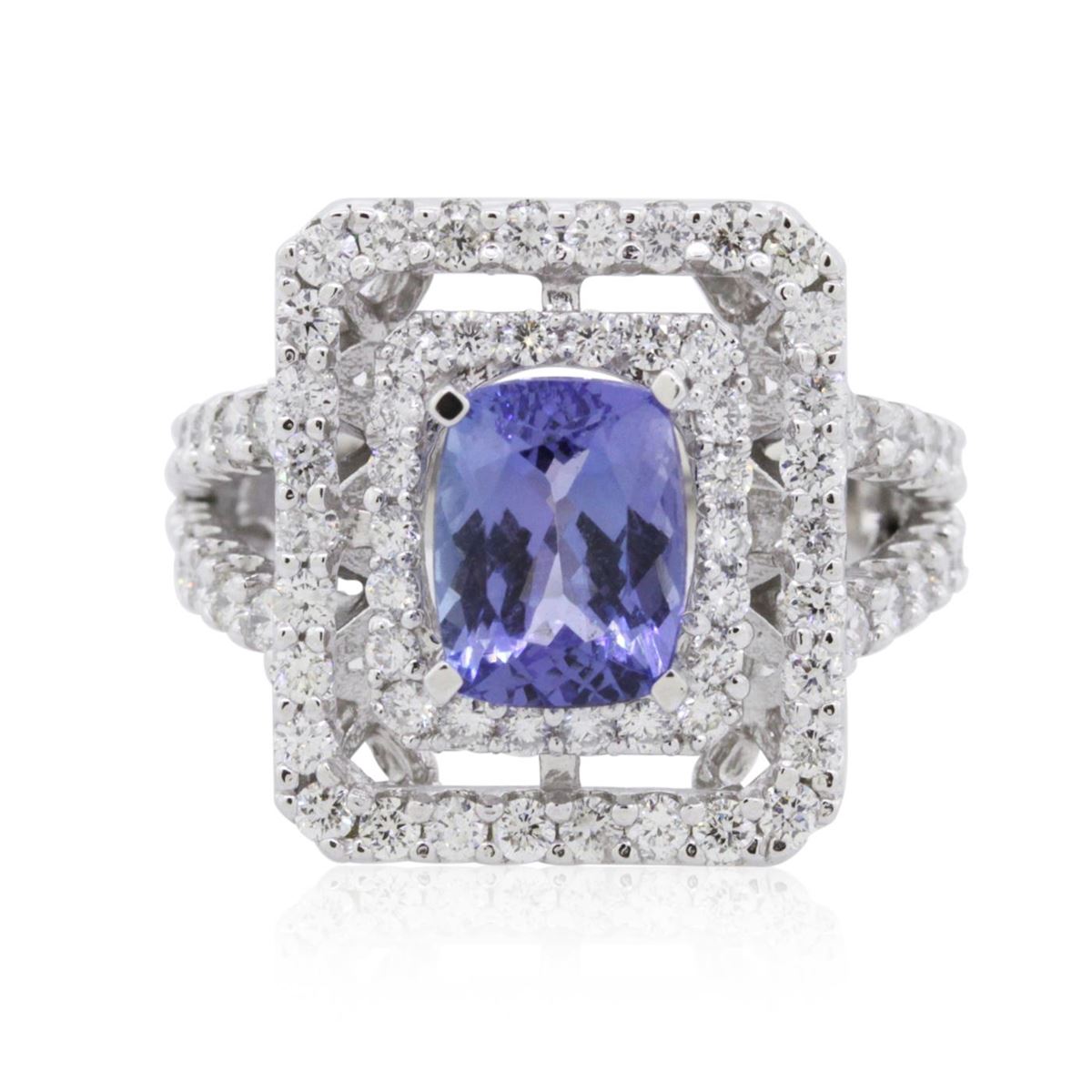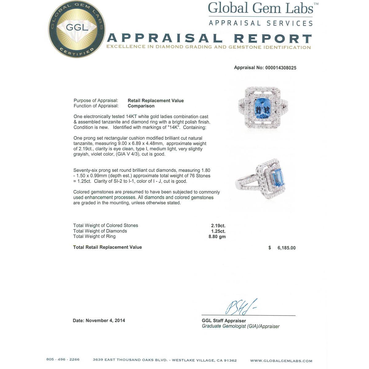 One electronically tested 14KT white gold ladies combination cast & assembled tanzanite and diamond ring with a bright polish finish. Identified with markings of "14K". Condition is new. Containing: One prong set rectangular cushion modified brilliant cut natural tanzanite, measuring 9.00 x 6.89 x 4.48mm, approximate weight of 2.19ct., clarity is eye clean, type I, medium light, very slightly grayish, violet color, (GIA V 4/3), cut is good. Seventy-Six prong set round brilliant cut diamonds, measuring 1.80 - 1.50 x 0.99mm (depth est.) approximate total weight of 76 Stones = 1.25ct. Clarity: SI-2 to I-1. Color: I - J, Cut is Good. Colored gemstones are presumed to have been subjected to commonly used enhancement processes. All diamonds and colored gemstones are graded in the mounting, unless otherwise stated. Total Weight of Colored Stones 2.19ct. Total Weight of Diamonds 1.25ct. Total Weight of Ring 8.80 grams. GGL Appraised at $6,185.00.