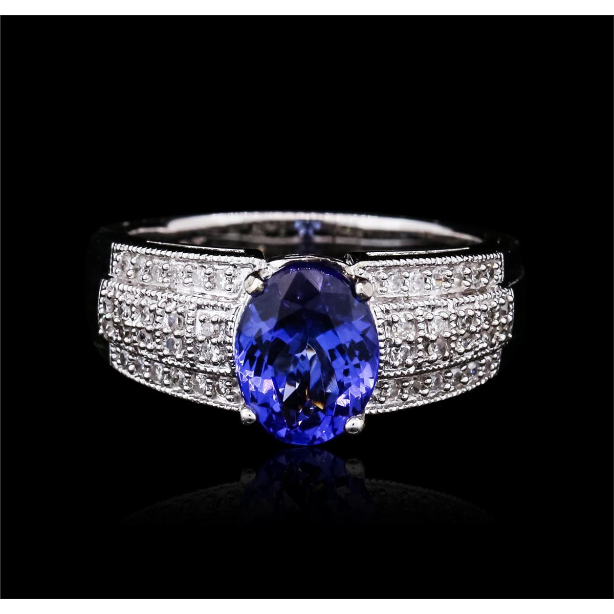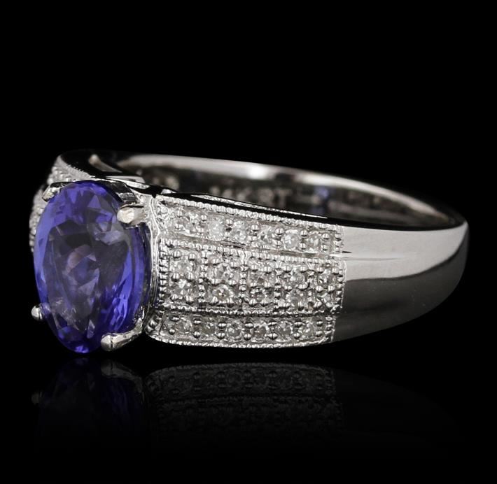 One electronically tested 14KT white gold ladies cast tanzanite and diamond ring with a bright and migraine finish. Condition is new, good workmanship. The featured tanzanite is supported by diamond set shoulders and completed by a two and one-half millimeter wide band. Trademark is RT. Identified with markings of "14K". Containing: One prong set oval mixed cut natural tanzanite, measuring 9.00 x 7.00 x 4.55mm, approximate weight of 2.19ct., clarity is eye clean, type I, medium dark, moderately strong, violetish blue color, (GIA vB 6/4), cut is good. Transmitting light with no distortion, transparent. Graded in the setting. Tanzanite is a very rare gemstone that is only found in the country of Tanzania. Originally discovered in 1967. Tiffany & Company, named the stone Tanzanite. It is found in the Usumburu Mountains that border the Umba Valley of northern Tanzania. Tanzanite occurs in gray, brown, violet, blue, reddish-purple, & green. The gem is interesting because of its exceptional pleochroism. Rotated in different directions a tanzanite will exhibit multiple changes of color. Tanzanite has a low tolerance to ultrasonic cleaning, and should not be cleaned using this method. Forty-four bead set single cut diamonds, measuring 1.00 - 1.00 x 0.60mm (depth est.) approximate total weight of 44 Stones = 0.20ct. Graded in the setting. Clarity SI-1 to I-1. Color G - I. Total Weight of Colored Stones 2.19ct. Total Weight of Diamonds 0.20ct. Total Weight of Ring 6.40gm. AIG Appraised at $7,555.00.