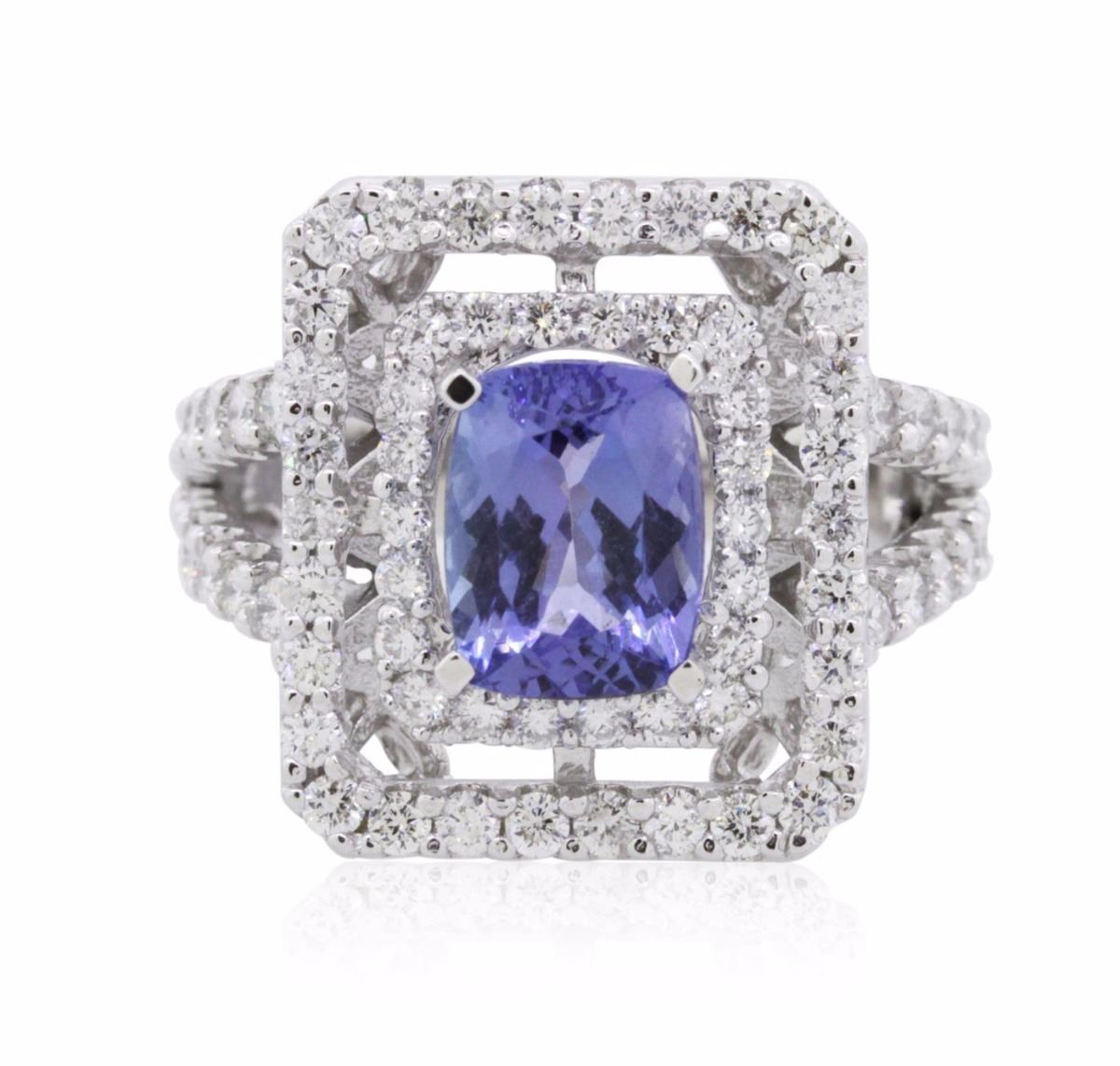 One electronically tested 14KT white gold ladies combination cast & assembled tanzanite and diamond ring with a bright polish finish. Identified with markings of "14K". Condition is new. Containing: One prong set rectangular cushion modified brilliant cut natural tanzanite, measuring 9.00 x 6.89 x 4.48mm, approximate weight of 2.19ct., clarity is eye clean, type I, medium light, very slightly grayish, violet color, (GIA V 4/3), cut is good. Seventy-Six prong set round brilliant cut diamonds, measuring 1.80 - 1.50 x 0.99mm (depth est.) approximate total weight of 76 Stones = 1.25ct. Clarity: SI-2 to I-1. Color: I - J, Cut is Good. Colored gemstones are presumed to have been subjected to commonly used enhancement processes. All diamonds and colored gemstones are graded in the mounting, unless otherwise stated. Total Weight of Colored Stones 2.19ct. Total Weight of Diamonds 1.25ct. Total Weight of Ring 8.80 grams. GGL Appraised at $6,185.00.