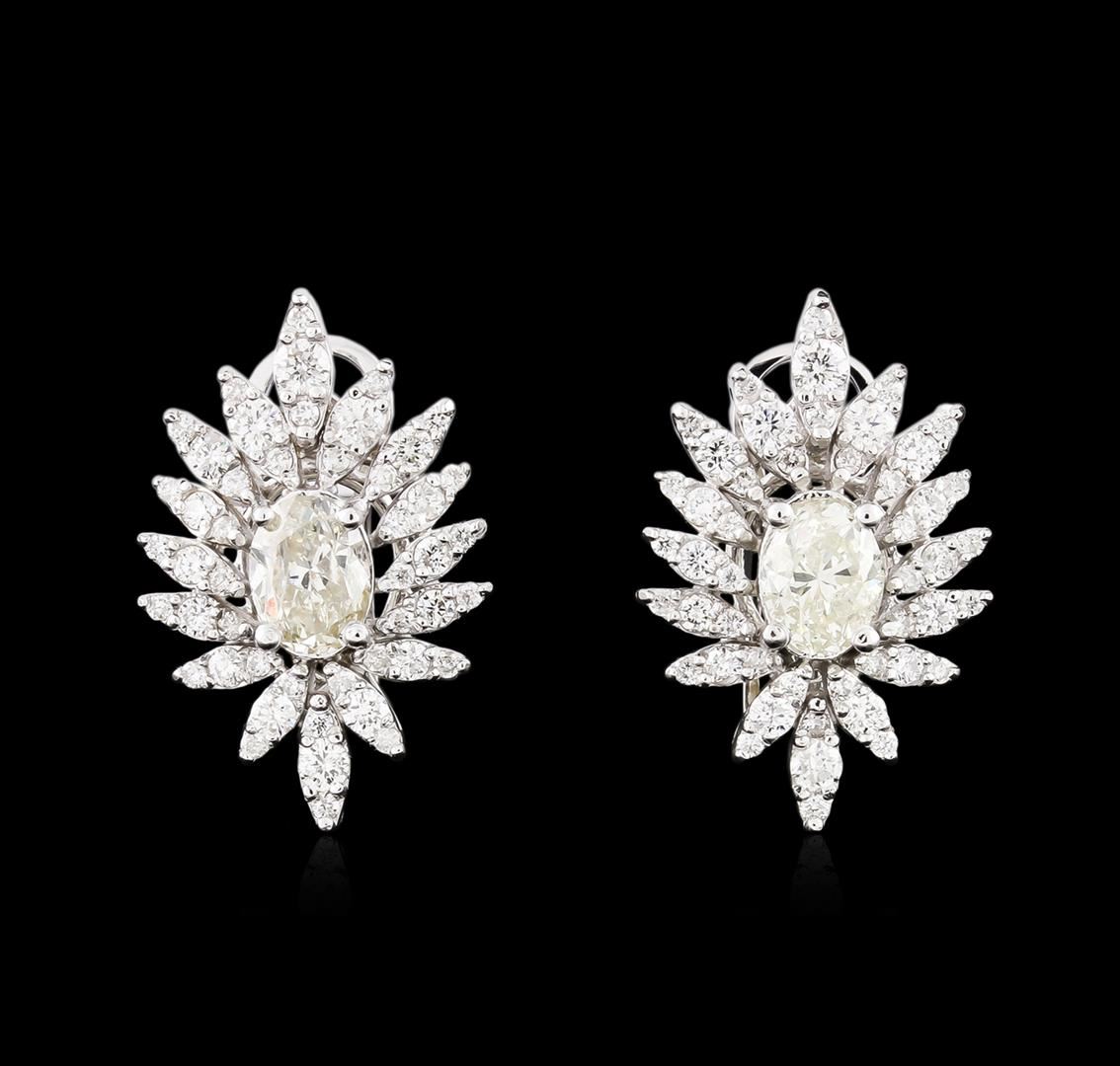 One pair electronically tested 14KT white gold ladies cast diamond earrings with Omega clip backs with a bright polish finish. Condition is new. Containing: Two prong set oval shaped cut diamonds, measuring 6.50 x 4.00 x 2.90mm (depth est.) approximate total weight of 2 Stones = 0.99ct. Clarity: SI-1 to SI-2. Color: L - M, Cut is Good. Ninety-Six prong set round brilliant cut diamonds, measuring 2.10 - 1.20 x 0.99mm (depth est.) approximate total weight of 96 Stones = 1.20ct. Clarity: SI-1 to SI-2. Color: I - J, Cut is Good. All diamonds are graded in the mounting, unless otherwise stated. Total Weight of Diamonds 2.19ct. Total Weight of Earrings 7.20 grams. GGL Appraised at $6,115.00.