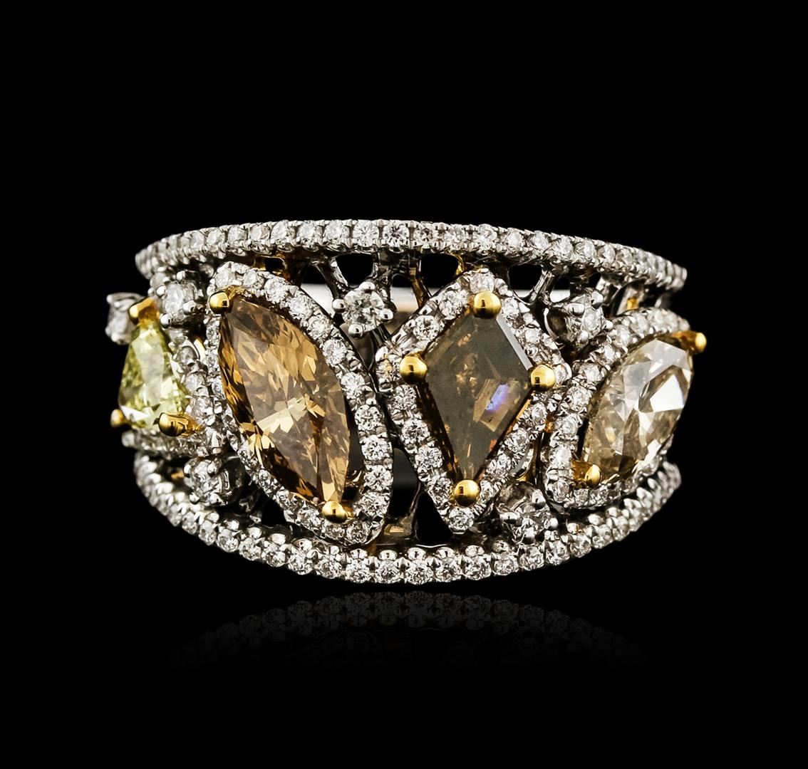 One electronically tested 14KT white gold ladies cast diamond ring with a tapered shank with a bright polish finish. Identified with markings of "14K". Condition is new. Containing: One prong set marquise shaped cut diamond, measuring 8.50 x 4.30 x 2.71mm (depth est.) approximate weight of 0.57ct. Clarity: VS-2,Color of Fancy Brown, Cut is Good. One prong set marquise shaped cut diamond, measuring 8.00 x 4.20 x 2.65mm (depth est.) approximate weight of 0.52ct. Clarity: SI-1, Color of Fancy Light Yellow, Cut is Good. One prong set step kite cut diamond, measuring 7.00 x 4.50 x 0.00mm (depth est.) approximate weight of 0.30ct. Clarity: I-1,Color of Fancy Brown, Cut is Good. One prong set triangle brilliant cut diamond, measuring 4.00 x 4.00 x 2.48mm (depth est.) approximate weight of 0.23ct. Clarity: SI-2, Color of Fancy Yellow, Cut is Good. Six prong set round brilliant cut diamonds, measuring 1.50 - 1.50 x 0.90mm (depth est.) approximate total weight of 6 Stones = 0.07ct. Clarity: SI-1 to SI-2. Color: I - J, Cut is Good. One Hundred Forty prong set round brilliant cut diamonds, measuring 1.00 - 1.00 x 0.60mm (depth est.) approximate total weight of 140 Stones = 0.50ct. Clarity: SI-2 to I-1. Color: I - J, Cut is Good. All diamonds are graded in the mounting, unless otherwise stated. Total Weight of Diamonds 2.19ct. Total Weight of Ring 6.40 grams. GGL Appraised at $6,760.00.