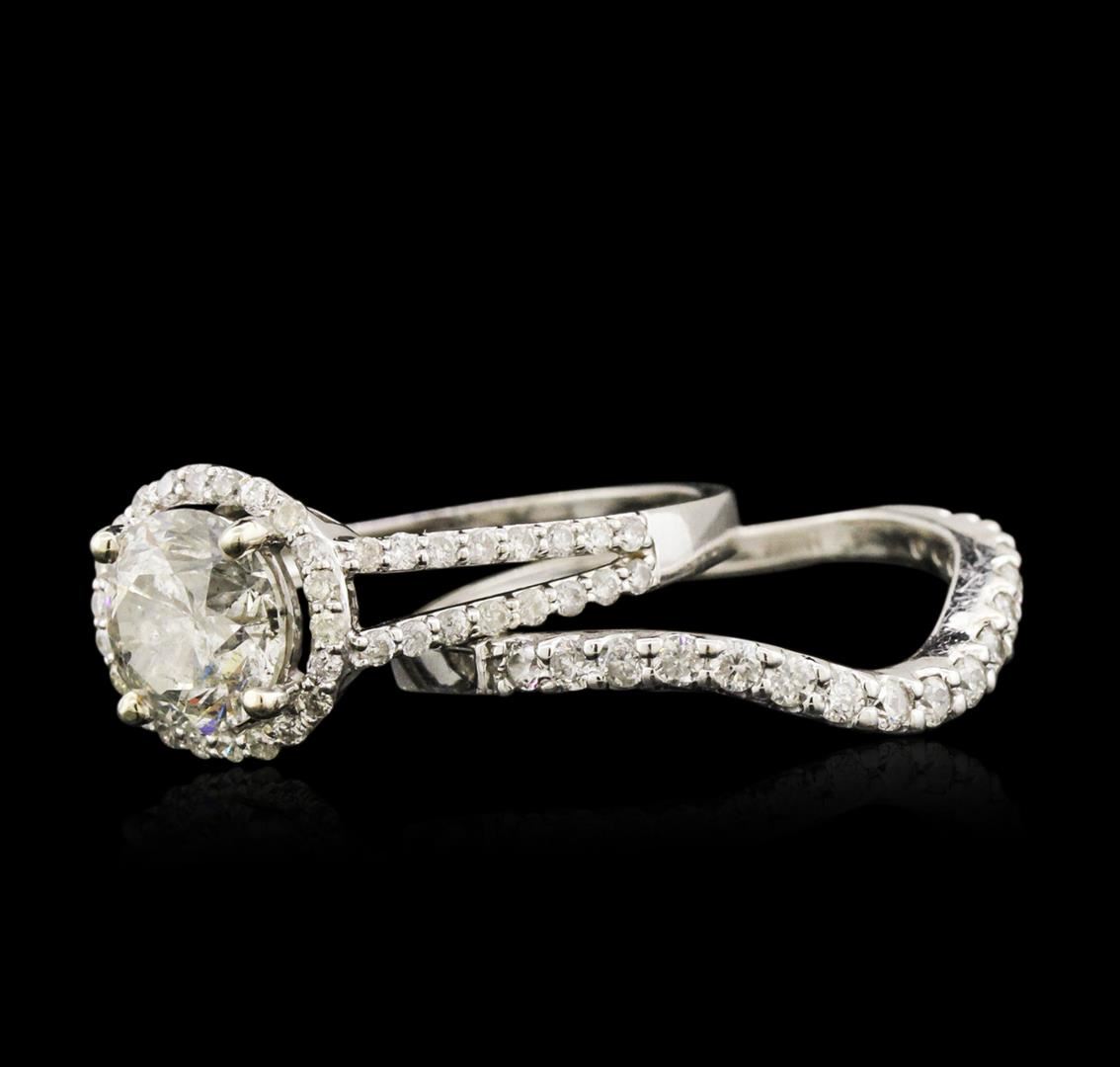 One electronically tested 14KT white gold ladies diamond wedding set with a bright polish finish. Condition is good. A two piece diamond wedding set. The engagement ring features a round diamond set within a diamond bezel, supported by diamond set shoulde AIG Appraised at $15,700.00.