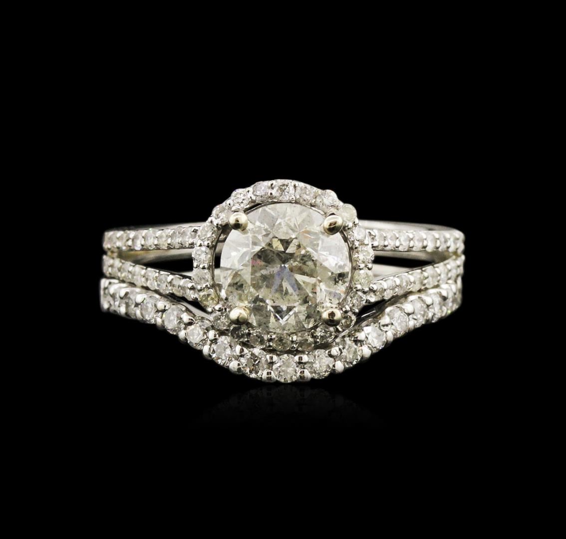 One electronically tested 14KT white gold ladies diamond wedding set with a bright polish finish. Condition is good. A two piece diamond wedding set. The engagement ring features a round diamond set within a diamond bezel, supported by diamond set shoulde AIG Appraised at $15,700.00.