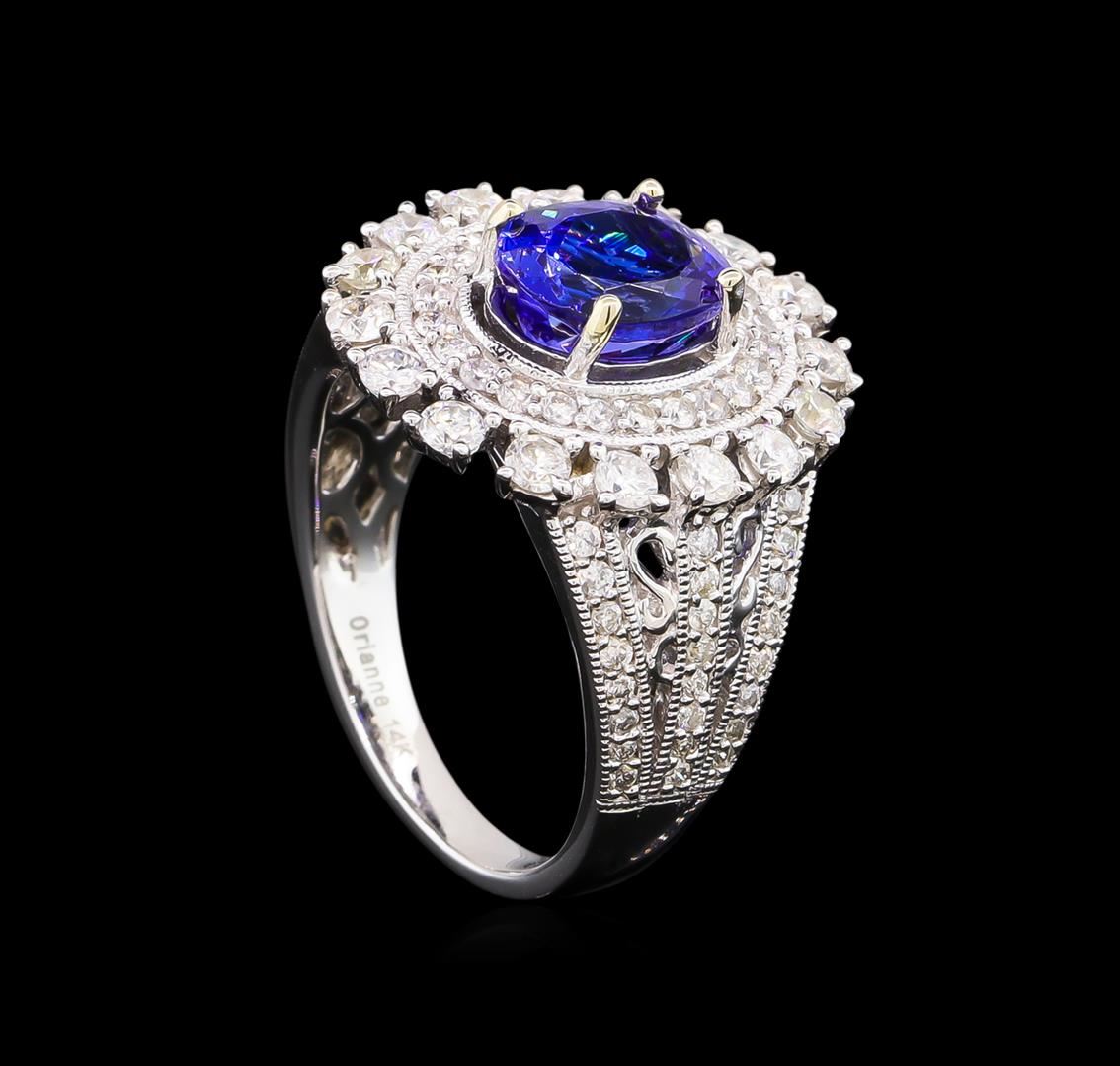 One electronically tested 14KT white gold Ladies combination cast & assembled ring with a bright polish finish. Condition is new. Identified with markings of "14K". Containing: One prong set oval modified brilliant cut natural tanzanite, measuring 8.00 x 6.00 x 3.90mm, approximate weight of 2.20 ct., clarity is eye clean, type I, medium, very slightly grayish, violet color, (GIA V 5/3), cut is very good. Colored gemstones are presumed to have been subjected to commonly used color/clarity enhancement processes. Eighty-Eight prong set round brilliant cut diamonds, measuring 2.00 - 1.30 x 0.99mm (depth est.) approximate. Total Weight of 88 Stones = 1.29ct. Clarity: I-1 to I-2. Color: I - J, Cut is Good. Total Weight of Colored Stones 2.20 ct. Total Weight of Diamonds 1.29ct. Total Weight of Ring 7.40 grams. GGL Appraised.