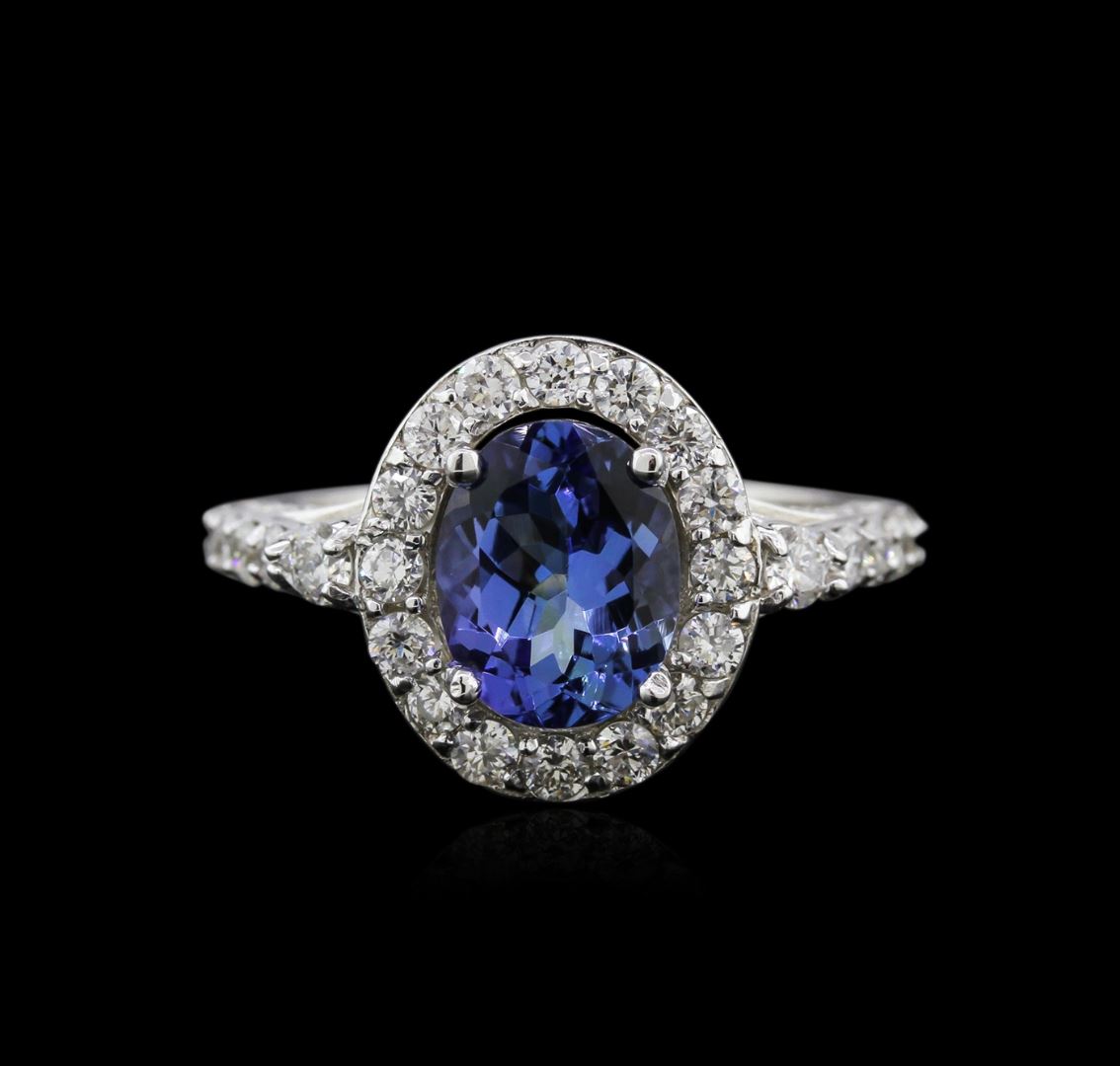 One electronically tested 14KT white gold ladies combination cast & assembled tanzanite and diamond ring with a half round shank with a bright polish finish. Identified with markings of "K14". Condition is new. Containing: One prong set oval modified brilliant cut natural tanzanite, measuring 9.55 x 7.23 x 4.61mm, exact weight 2.20ct., clarity is eye clean, type I, medium light, very slightly grayish, violet color, (GIA V 4/3), cut is good. Twenty-Six prong set round brilliant cut diamonds, measuring 2.50 - 1.90 x 1.32mm (depth est.) approximate total weight of 26 Stones = 0.87ct. Clarity: SI-1 to SI-2. Color: H - I, Cut is Good. Forty-Eight prong set round brilliant cut diamonds, measuring 1.10 - 1.10 x 0.66mm (depth est.) approximate total weight of 48 Stones = 0.23ct. Clarity: SI-2 to I-1. Color: G - H, Cut is Good. All diamonds and colored gemstones are graded in the mounting, unless otherwise stated. Colored gemstones are presumed to have been subjected to commonly used enhancement processes.. Total Weight of Colored Stones 2.20ct. Total Weight of Diamonds 1.10ct. Total Weight of Ring 5.00 grams. GGL Appraised at $4,280.00.