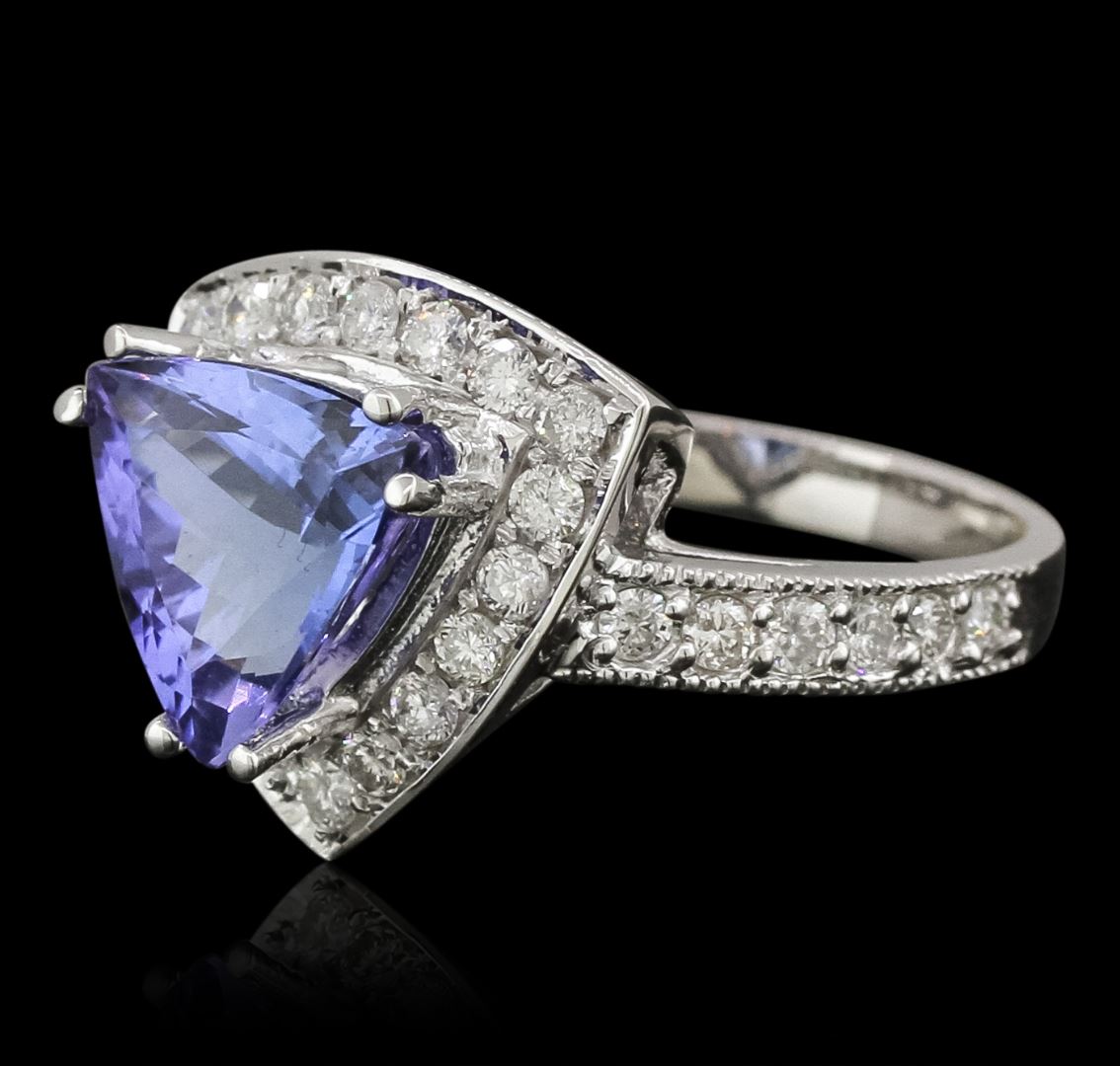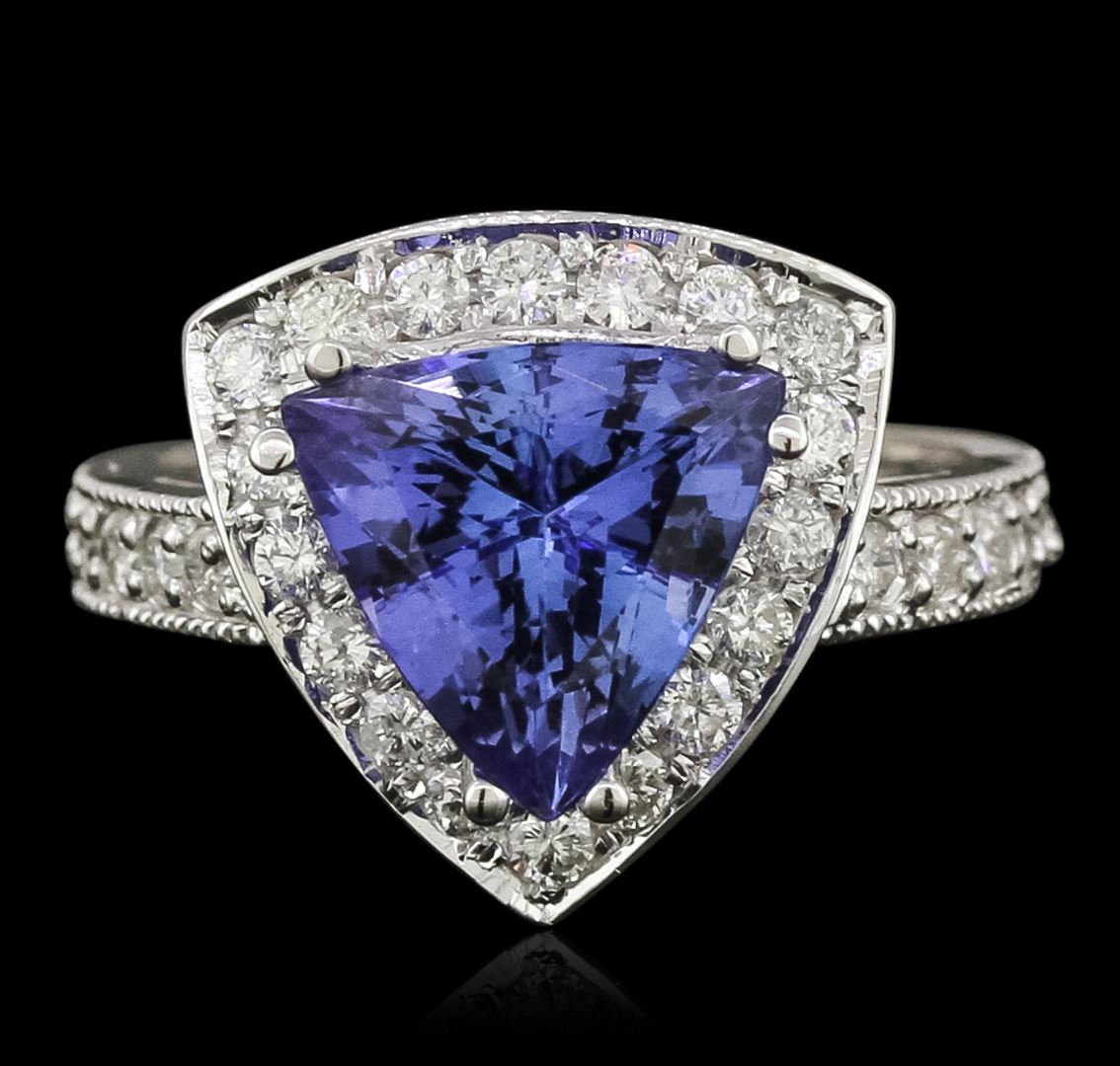 One electronically tested 14KT white gold ladies combination cast & assembled tanzanite and diamond ring with a flat shank with a bright polish finish. Identified with markings of "K14". Condition is new. Containing: One prong set triangle modified brilliant cut natural tanzanite, measuring 9.81 x 8.95 x 4.15mm, approximate weight of 2.20ct., clarity is eye clean, type I, medium, moderately strong, violet color, (GIA V 5/4), cut is good. Thirty prong set round brilliant cut diamonds, measuring 1.70 - 1.70 x 1.02mm (depth est.) approximate total weight of 30 Stones = 0.54ct. Clarity: SI-2 to I-1. Color: I - J, Cut is Good. Colored gemstones are presumed to have been subjected to commonly used enhancement processes. All diamonds and colored gemstones are graded in the mounting, unless otherwise stated. Total Weight of Colored Stones 2.20ct. Total Weight of Diamonds 0.54ct. Total Weight of Ring 5.60 grams. GGL Appraised at $6,085.00.