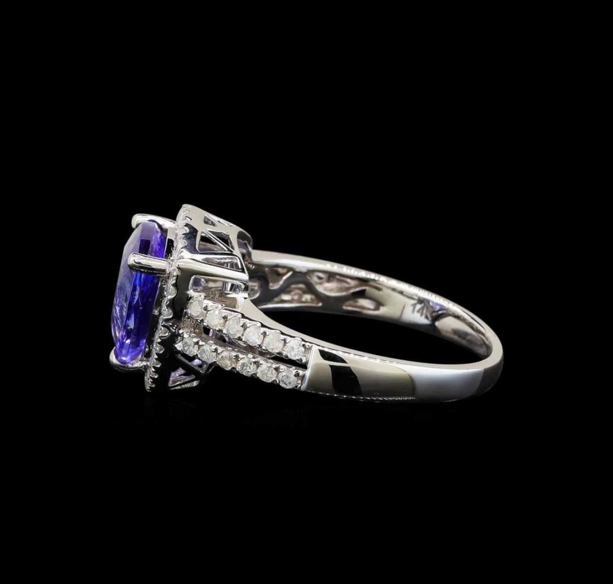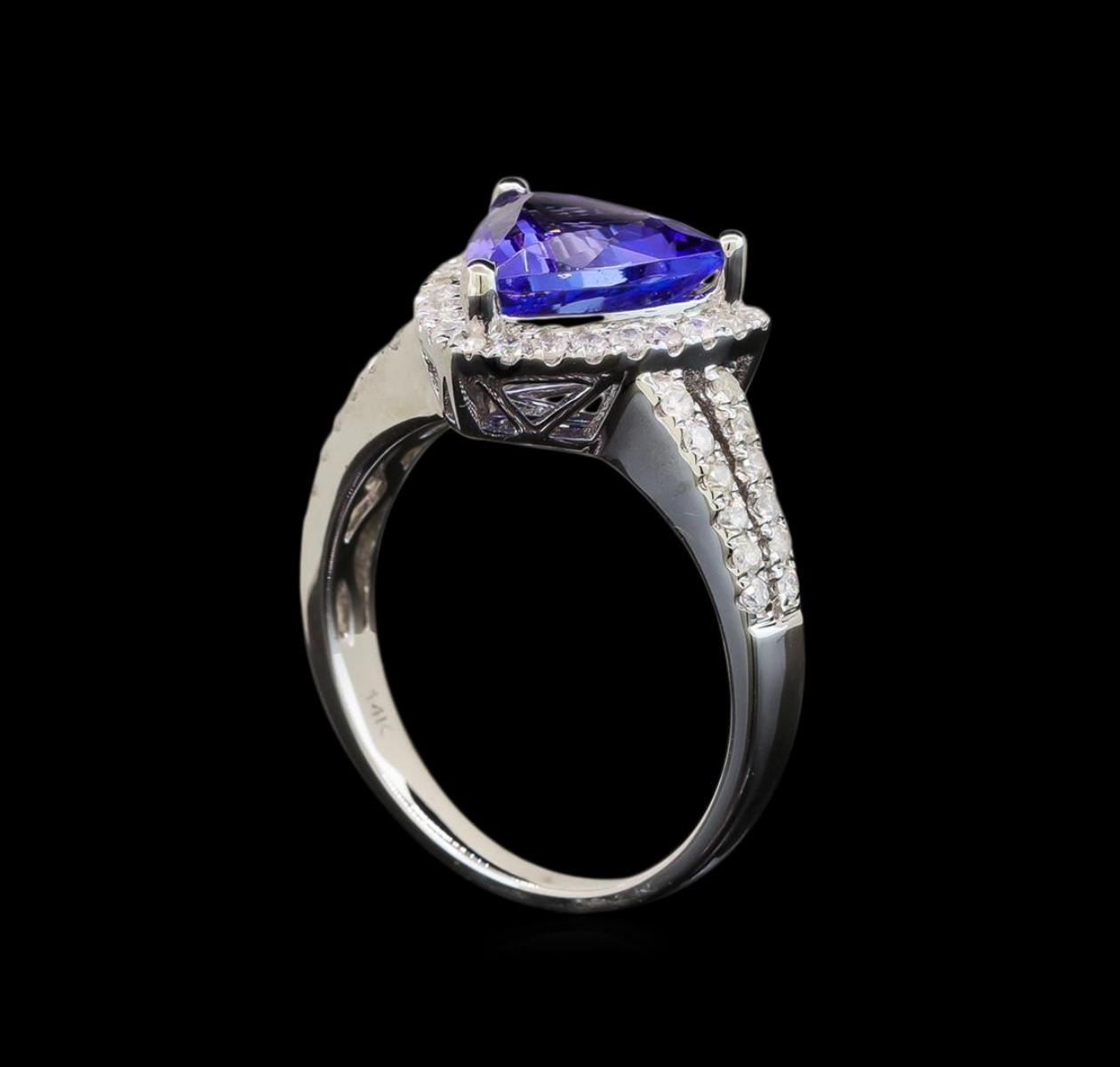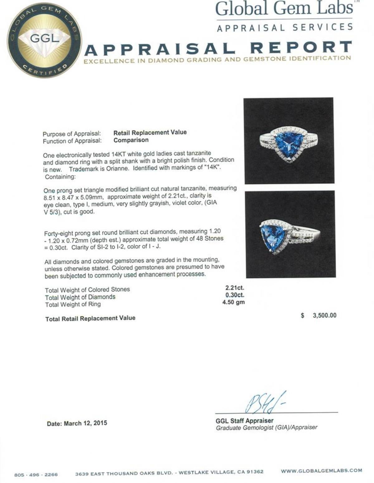 One electronically tested 14KT white gold ladies cast tanzanite and diamond ring with a split shank with a bright polish finish. Trademark is Orianne. Identified with markings of "14K". Condition is new. Containing: One prong set triangle modified brilliant cut natural tanzanite, measuring 8.51 x 8.47 x 5.09mm, approximate weight of 2.21ct., clarity is eye clean, type I, medium, very slightly grayish, violet color, (GIA V 5/3), cut is good. Forty-Eight prong set round brilliant cut diamonds, measuring 1.20 - 1.20 x 0.72mm (depth est.) approximate total weight of 48 Stones = 0.30 ct. Clarity: SI-2 to I-2. Color: I - J. All diamonds and colored gemstones are graded in the mounting, unless otherwise stated. Colored gemstones are presumed to have been subjected to commonly used enhancement processes. Total Weight of Colored Stones 2.21ct. Total Weight of Diamonds 0.30 ct. Total Weight of Ring 4.50 grams. GGL Appraised.