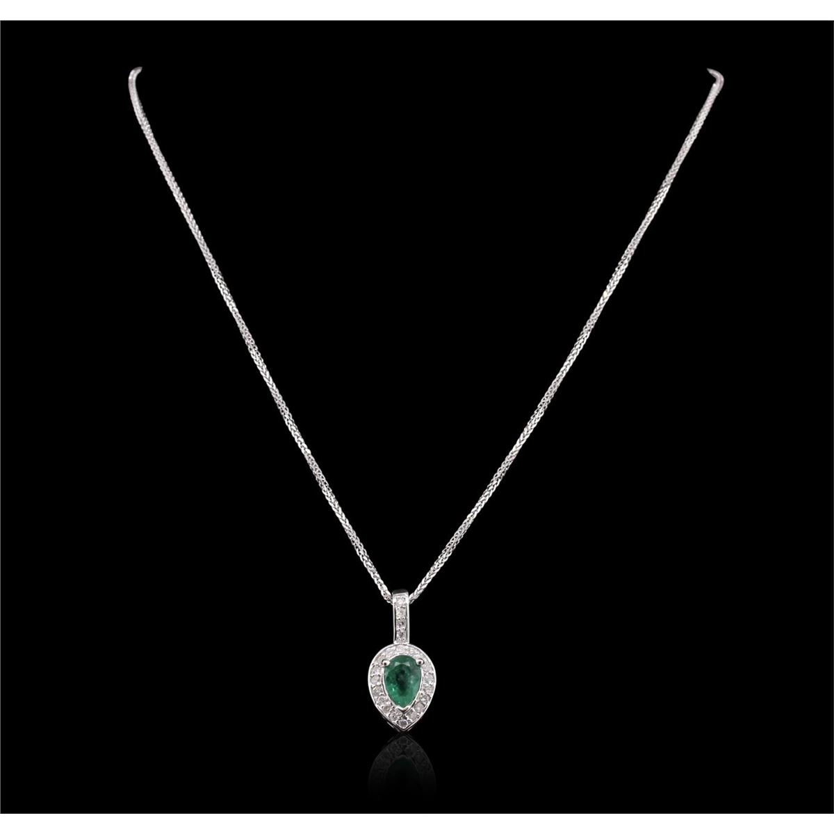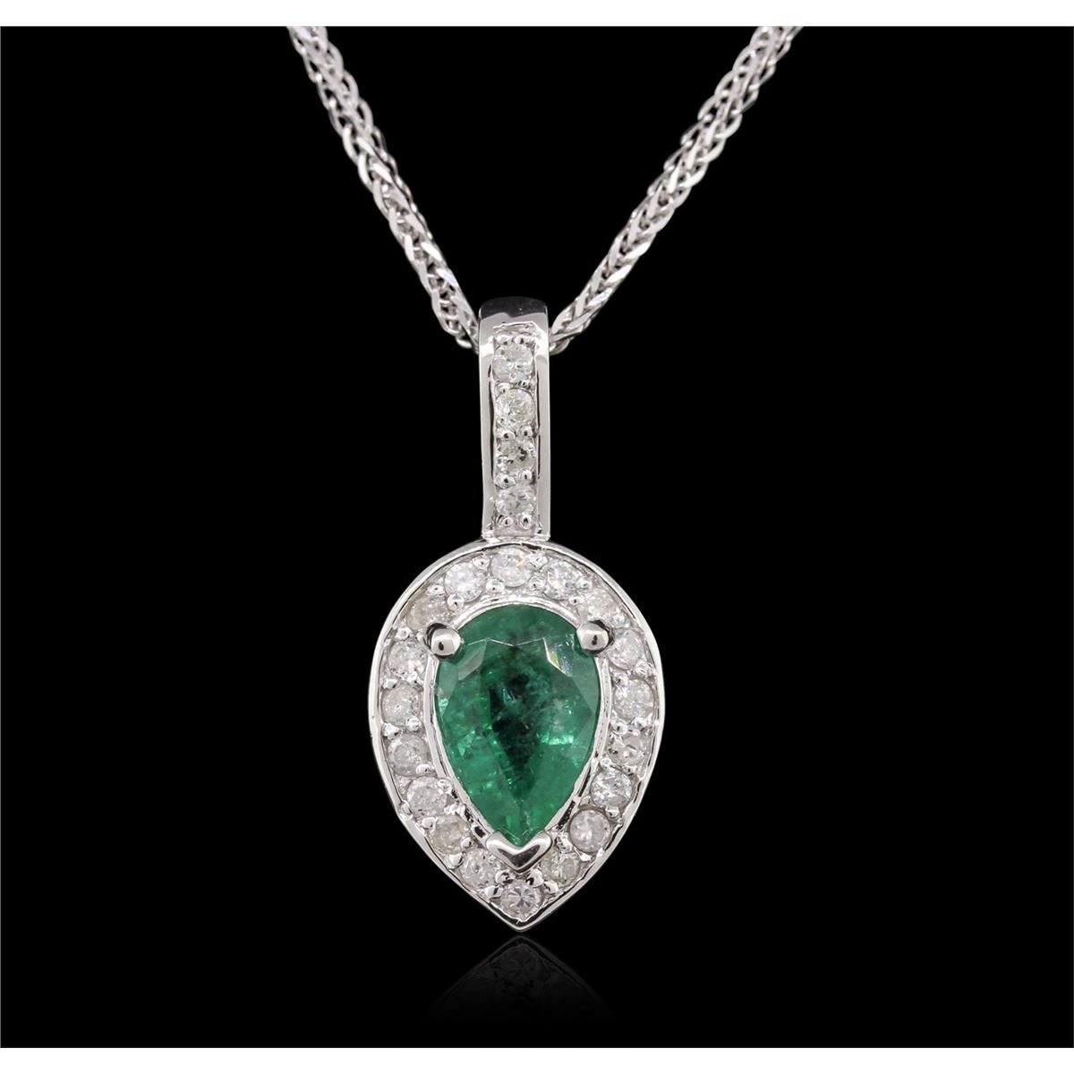 One electronically tested 14KT white gold ladies cast & assembled emerald and diamond pendant with chain. Condition is new, good workmanship. The pendant features an emerald set within a diamond bezel, completed by a diamond set bail. The pendant is supported by an eighteen inch length 14KT white gold designer style chain, terminating in a lobster claw clasp. Bright polish finish. Identified with markings of "14K". Containing: One prong set pear mixed cut natural emerald, measuring 10.52 x 6.80 x 5.20mm, 10%. bulge factor, approximate weight of 2.21ct., clarity is heavily included, type III, medium dark, moderately strong, very slightly bluish green color, (GIA vslbG 6/4), cut is good. Transmitting light with a minimum of distortion, transparent. Naturally occurring internal & external characteristics are present. Indications of oil residue. Graded in the setting. Twenty-Two prong set round brilliant cut diamonds, measuring 1.80 - 1.70 x 1.05mm (depth est.) approximate. Total Weight of 22 Stones = 0.52ct. Graded in the setting. Clarity: I-1 to I-2. Color: G - I. Total Weight of Colored Stones 2.21ct. Total Weight of Diamonds 0.52ct. Total Weight of Pendant With Chain 7.53 grams. AIG Appraised at $6,740.00.