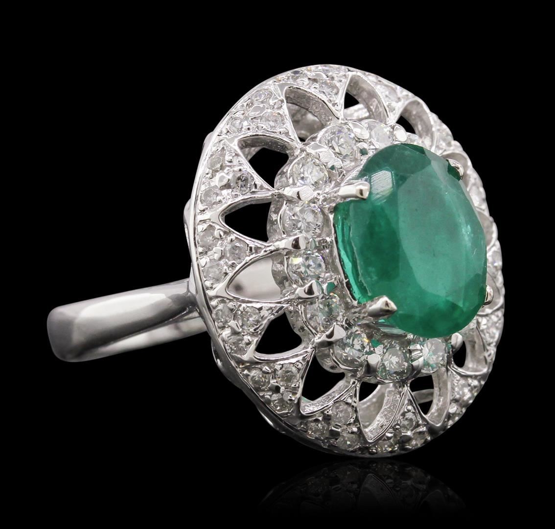 One electronically tested 14KT white gold Ladies combination cast & assembled ring with a bright polish finish. Condition is new. Identified with markings of "14K". Containing: One prong set oval modified brilliant cut natural emerald, measuring 10.10 x 7.80 x 5.07mm, approximate weight of 2.21ct., clarity is heavily included, type III, medium dark, moderately strong, green color, (GIA G 6/4), cut is good. Colored gemstones are presumed to have been subjected to commonly used color/clarity enhancement processes. Fifty-Six prong set round brilliant cut diamonds, measuring 2.00 - 1.30 x 0.99mm (depth est.) approximate. Total Weight of 56 Stones = 0.92ct. Clarity: SI-2 to I-2. Color: H - I, Cut is Good. Total Weight of Colored Stones 2.21ct. Total Weight of Diamonds 0.92ct. Total Weight of Ring 8.50 grams. GGL Appraised at $9,220.00.