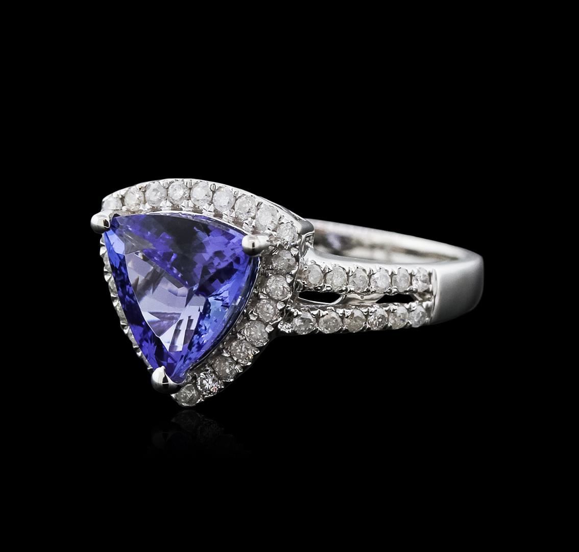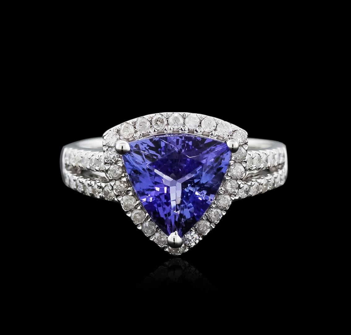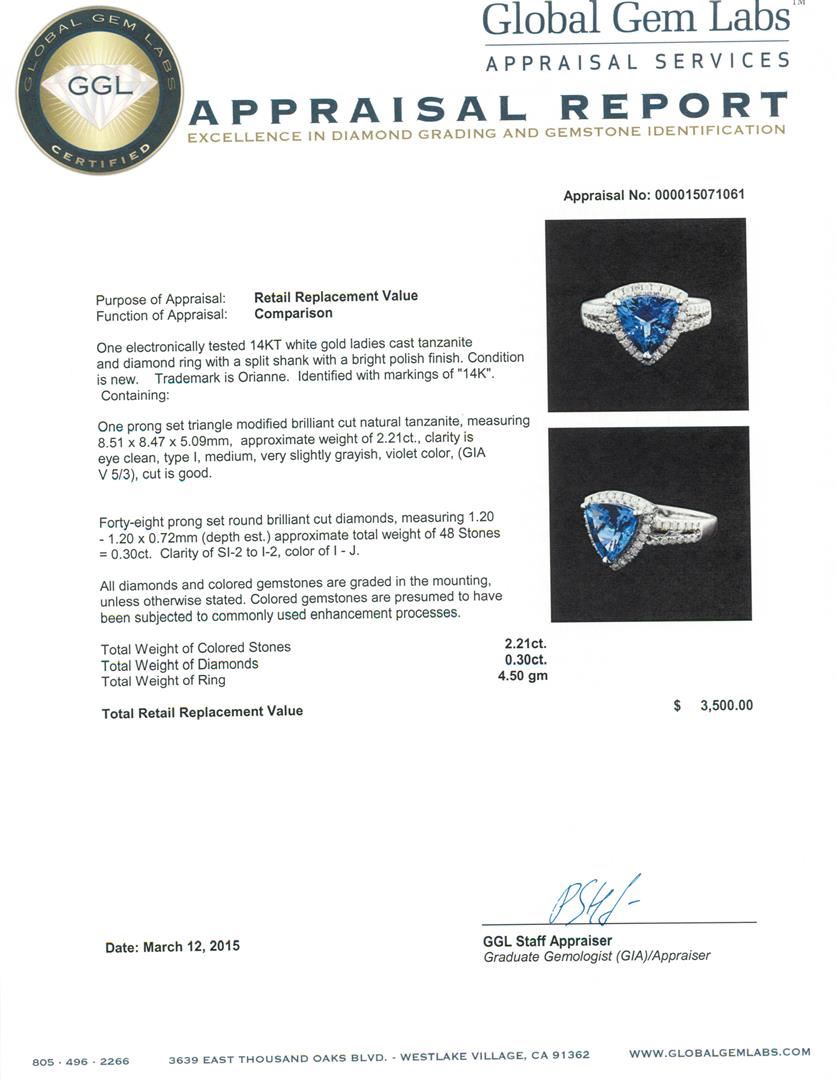 One electronically tested 14KT white gold ladies cast tanzanite and diamond ring with a split shank with a bright polish finish. Trademark is Orianne. Identified with markings of "14K". Condition is new. Containing: One prong set triangle modified brilliant cut natural tanzanite, measuring 8.51 x 8.47 x 5.09mm, approximate weight of 2.21ct., clarity is eye clean, type I, medium, very slightly grayish, violet color, (GIA V 5/3), cut is good. Forty-Eight prong set round brilliant cut diamonds, measuring 1.20 - 1.20 x 0.72mm (depth est.) approximate total weight of 48 Stones = 0.30ct. Clarity: SI-2 to I-2. Color: I - J. All diamonds and colored gemstones are graded in the mounting, unless otherwise stated. Colored gemstones are presumed to have been subjected to commonly used enhancement processes. Total Weight of Colored Stones 2.21ct. Total Weight of Diamonds 0.30ct. Total Weight of Ring 4.50 grams. GGL Appraised at $3,500.00.