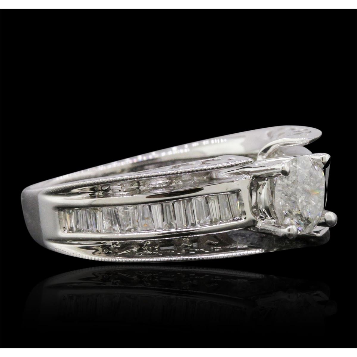 One electronically tested 14KT white gold ladies combination cast & assembled engagement ring with a flat shank with a bright polish finish. Identified with markings of "14K". Condition is new. Containing: One prong set round brilliant cut diamond, measuring 5.63 - 5.62 x 3.38mm (depth est.) approximate weight of 0.65ct. Clarity: I-2. Color: I, Cut is Good. Twenty-Eight channel set baguette cut diamonds, measuring 2.00 x 1.50 x 1.28mm (depth est.) approximate total weight of 28 Stones = 1.56ct. Clarity: SI-1 to I-1. Color: I - J, Cut is Good. All diamonds are graded in the mounting, unless otherwise stated. Total Weight of Diamonds 2.21ct. Total Weight of Ring 4.90 grams. GGL Appraised at $6,995.00.