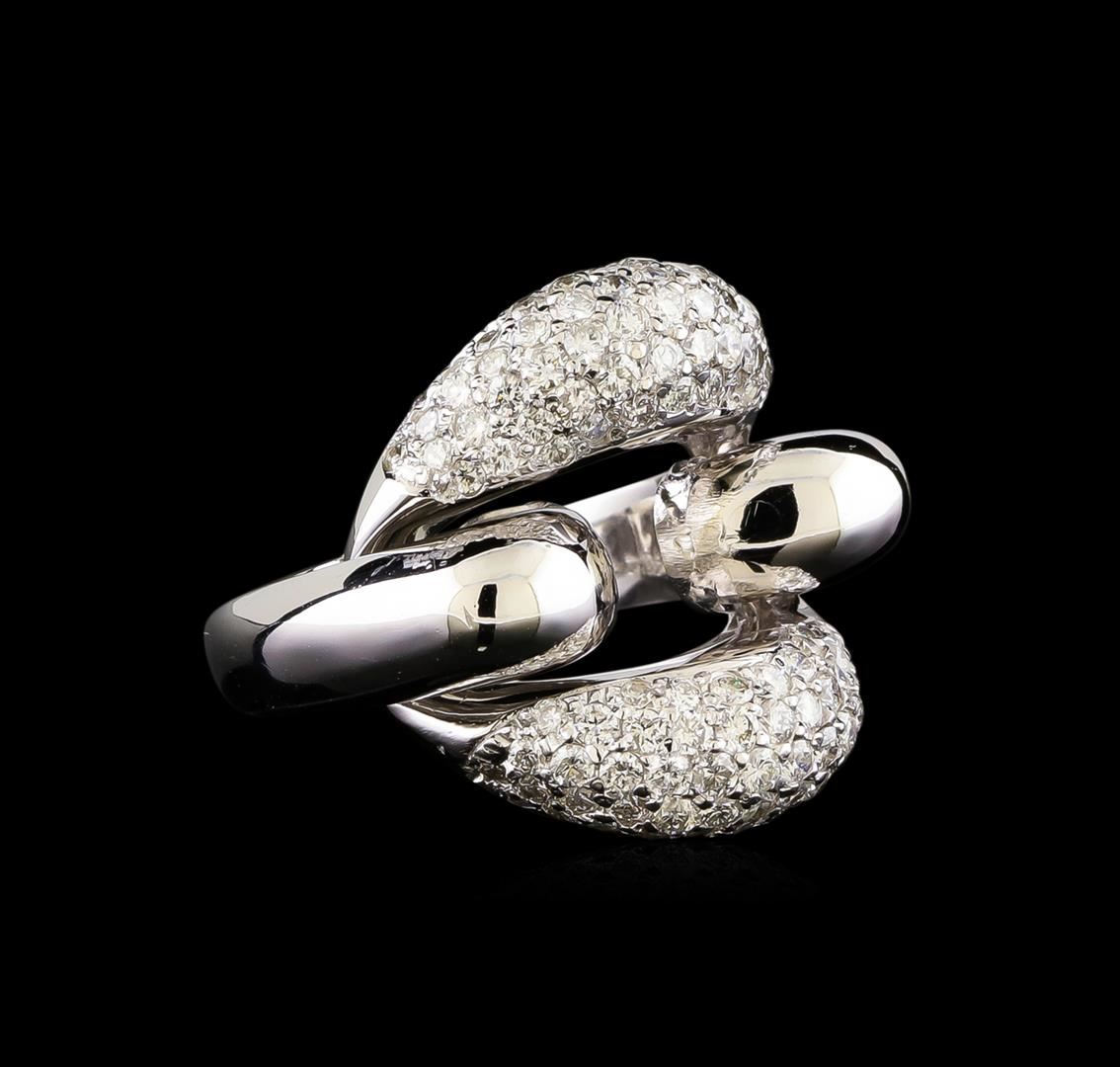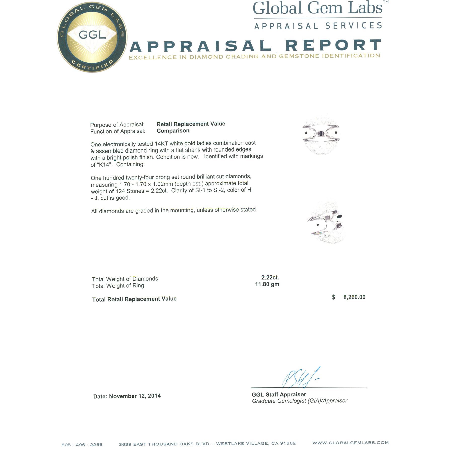 One electronically tested 14KT white gold ladies combination cast & assembled diamond ring with a flat shank with rounded edges with a bright polish finish. Identified with markings of "K14". Condition is new. Containing: One Hundred Twenty-Four prong set round brilliant cut diamonds, measuring 1.70 - 1.70 x 1.02mm (depth est.) approximate total weight of 124 Stones = 2.22ct. Clarity: SI-1 to SI-2. Color: H - J, Cut is Good. All diamonds are graded in the mounting, unless otherwise stated. Total Weight of Diamonds 2.22ct. Total Weight of Ring 11.80 grams. GGL Appraised at $8,260.00.