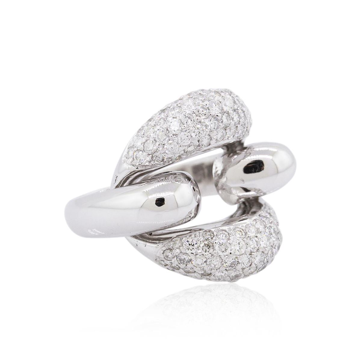 One electronically tested 14KT white gold ladies combination cast & assembled diamond ring with a flat shank with rounded edges with a bright polish finish. Identified with markings of "K14". Condition is new. Containing: One Hundred Twenty-Four prong set round brilliant cut diamonds, measuring 1.70 - 1.70 x 1.02mm (depth est.) approximate total weight of 124 Stones = 2.22ct. Clarity: SI-1 to SI-2. Color: H - J, Cut is Good. All diamonds are graded in the mounting, unless otherwise stated. Total Weight of Diamonds 2.22ct. Total Weight of Ring 11.80 grams. GGL Appraised at $8,260.00.