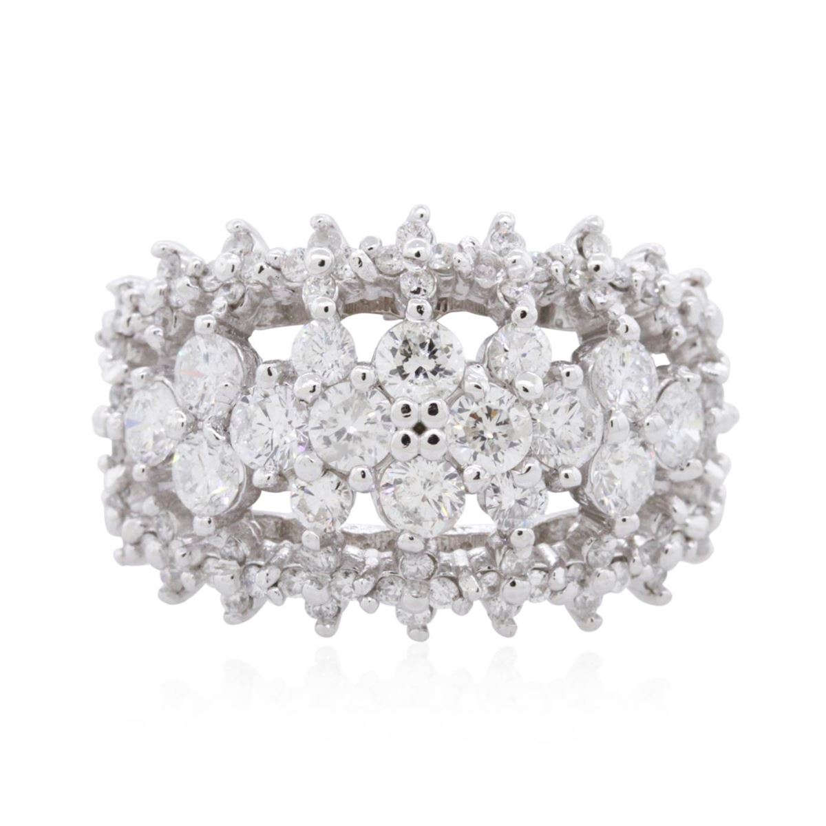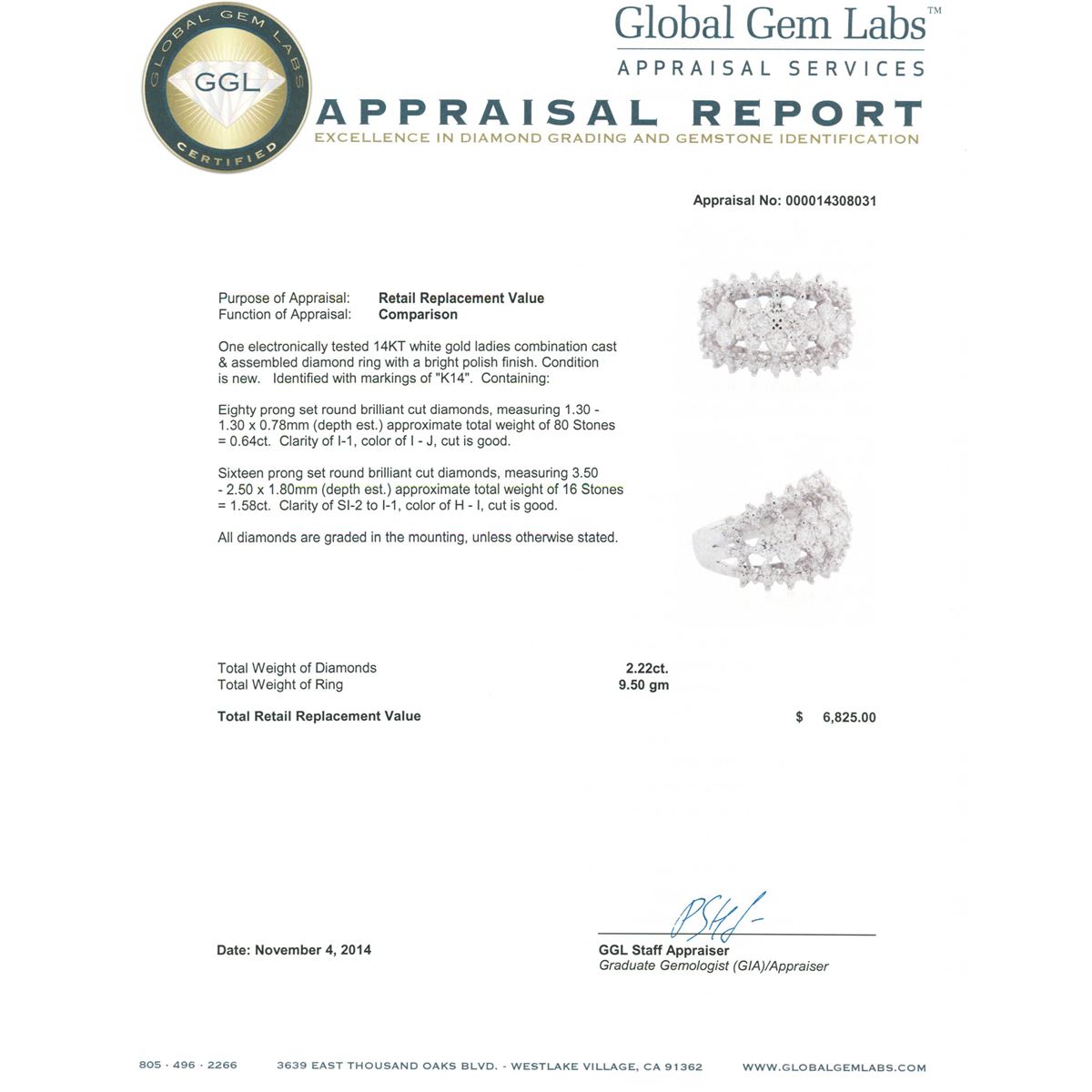 One electronically tested 14KT white gold ladies combination cast & assembled diamond ring with a bright polish finish. Identified with markings of "K14". Condition is new. Containing: Eighty prong set round brilliant cut diamonds, measuring 1.30 - 1.30 x 0.78mm (depth est.) approximate total weight of 80 Stones = 0.64ct. Clarity: I-1. Color: I - J, Cut is Good. Sixteen prong set round brilliant cut diamonds, measuring 3.50 - 2.50 x 1.80mm (depth est.) approximate total weight of 16 Stones = 1.58ct. Clarity: SI-2 to I-1. Color: H - I, Cut is Good. All diamonds are graded in the mounting, unless otherwise stated. Total Weight of Diamonds 2.22ct. Total Weight of Ring 9.50 grams. GGL Appraised at $6,825.00.