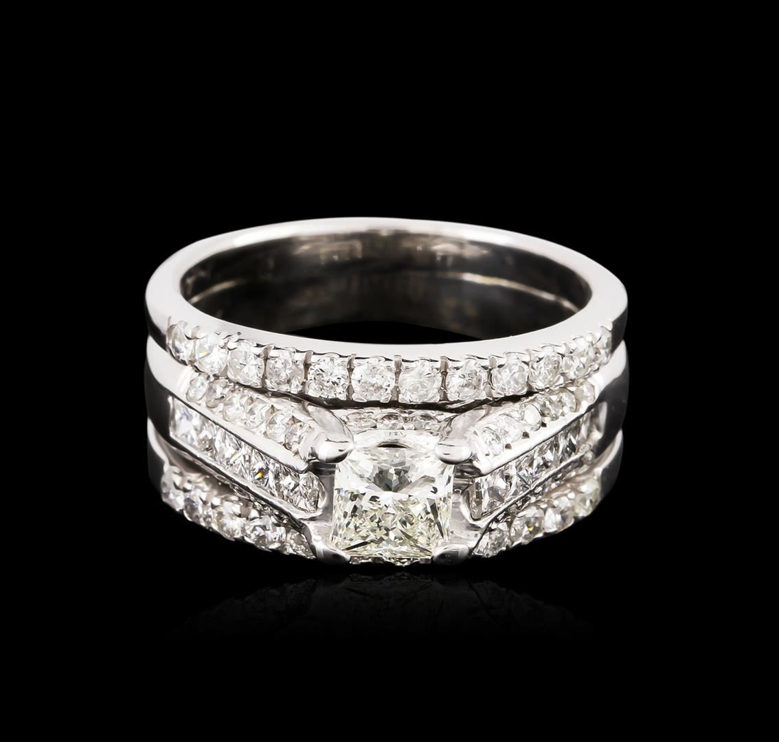 One electronically tested 14KT white gold ladies cast & assembled diamond wedding set. The wedding set includes a diamond engagement ring and two diamond wedding bands. The engagement ring features a cathedral set diamond supported by a diamond set under gallery and diamond set shoulders. The two diamond wedding bands mirror the engagement ring. The set is completed by soldered bands measuring six and one-half millimeter wide band. Bright polish finish. Identified with markings of "14K". Condition is good. Containing: One prong set princess cut diamond, measuring 4.75 x 4.65 x 3.25mm (depth est.) approximate weight of 0.69ct with a faint blue fluorescence. Graded in the setting. Clarity: SI-1. Color: 69.9%. Table 77.4%. Ten channel set princess cut diamonds, measuring 2.10 x 2.00 x 1.50mm (depth est.) approximate total weight of 10 Stones = 0.61ct. Graded in the setting. Clarity: VS-1 to VS-2. Color: H - J Thirty prong set round brilliant cut diamonds, measuring 1.50 - 1.40 x 0.87mm (depth est.) approximate total weight of 30 Stones = 0.35ct. Graded in the setting. Clarity: SI-1 to I-1. Color: H - J Twenty-Four prong set round brilliant cut diamonds, measuring 1.80 - 1.70 x 1.05mm (depth est.) approximate total weight of 24 Stones = 0.57ct. Graded in the setting. Clarity: SI-2 to I-1. Color: G - I. Total Weight of Diamonds 2.22ct. Total Weight of Wedding Set 8.69 grams. AIG Appraised at $8,630.00.
