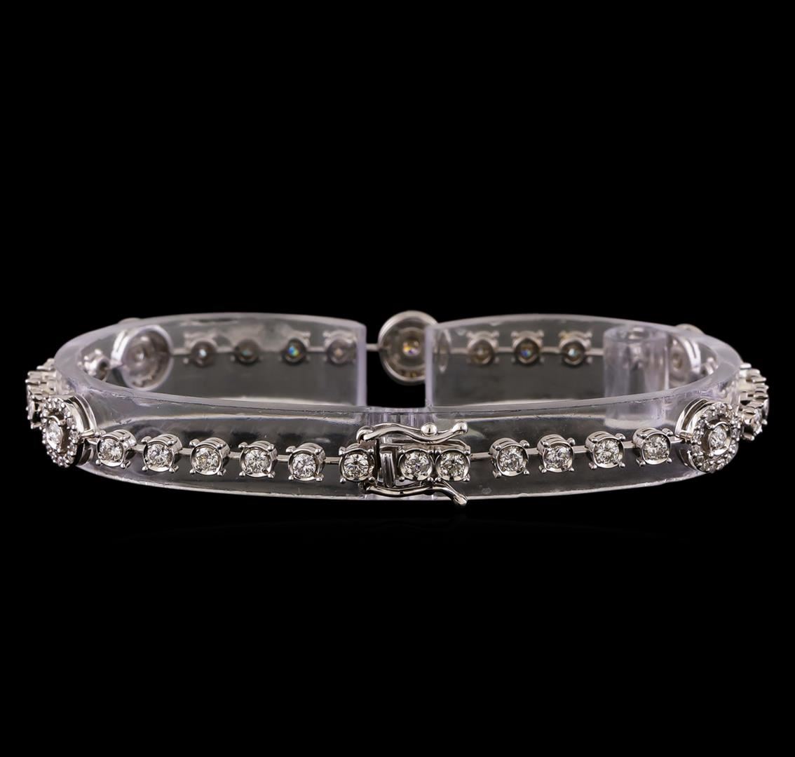 One electronically tested 14KT white gold ladies cast diamond bracelet with a hidden box clasp with safety closer with a bright polish finish. Measurements: 7" in length Identified with markings of "14K". Condition is new. Containing: Thirty-Three prong set round brilliant cut diamonds, measuring 2.50 - 2.50 x 1.50mm (depth est.) approximate total weight of 33 Stones = 1.88ct. Clarity: SI-1 to SI-2. Color: I - J, Cut is Good. Ninety-Six prong set round brilliant cut diamonds, measuring 1.00 - 1.00 x 0.60mm (depth est.) approximate total weight of 96 Stones = 0.35ct. Clarity: I-1 to I-2. Color: I - J, Cut is Good. All diamonds are graded in the mounting, unless otherwise stated. Total Weight of Diamonds 2.23ct. Total Weight of Bracelet 9.00 grams. GGL Appraised at $11,920.00.