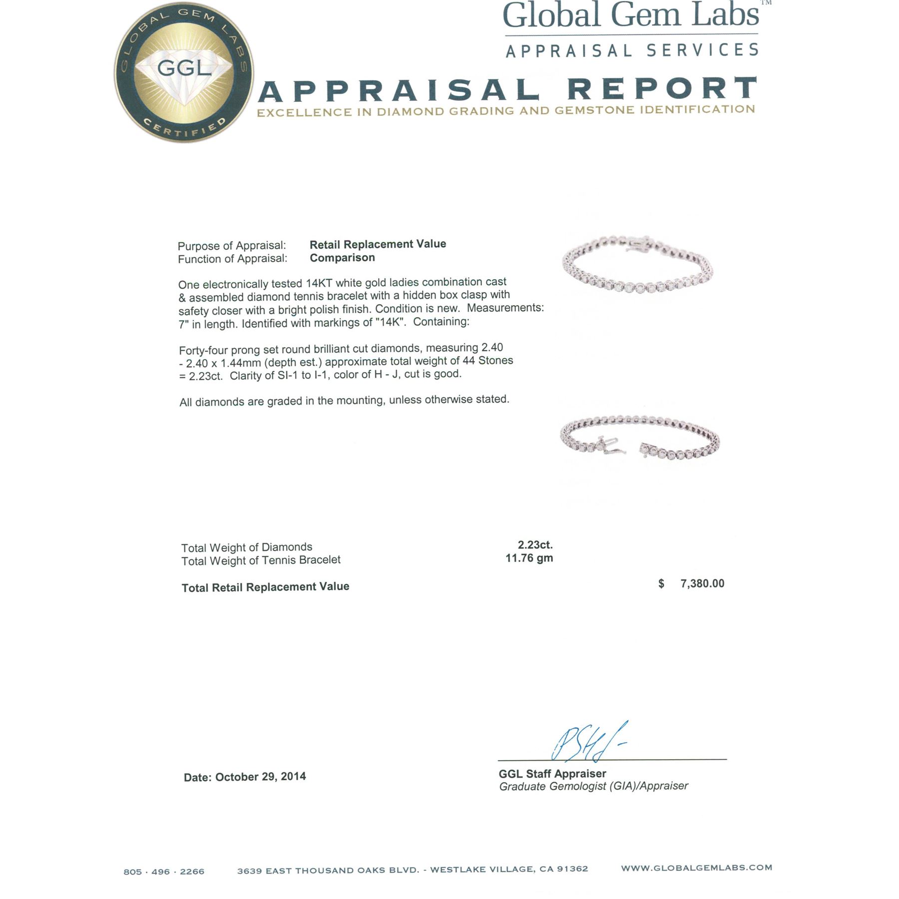 One electronically tested 14KT white gold ladies combination cast & assembled diamond tennis bracelet with a hidden box clasp with safety closer with a bright polish finish. Measurements: 7 in length. Identified with markings of 14K. Condition is new. Containing: Forty-Four prong set round brilliant cut diamonds, measuring 2.40 - 2.40 x 1.44mm (depth est.) approximate total weight of 44 Stones = 2.23ct. Clarity: SI-1 to I-1. Color: H - J, Cut is Good. All diamonds are graded in the mounting, unless otherwise stated. Total Weight of Diamonds 2.23ct. Total Weight of Tennis Bracelet 11.76 grams. GGL Appraised at $7,380.00.