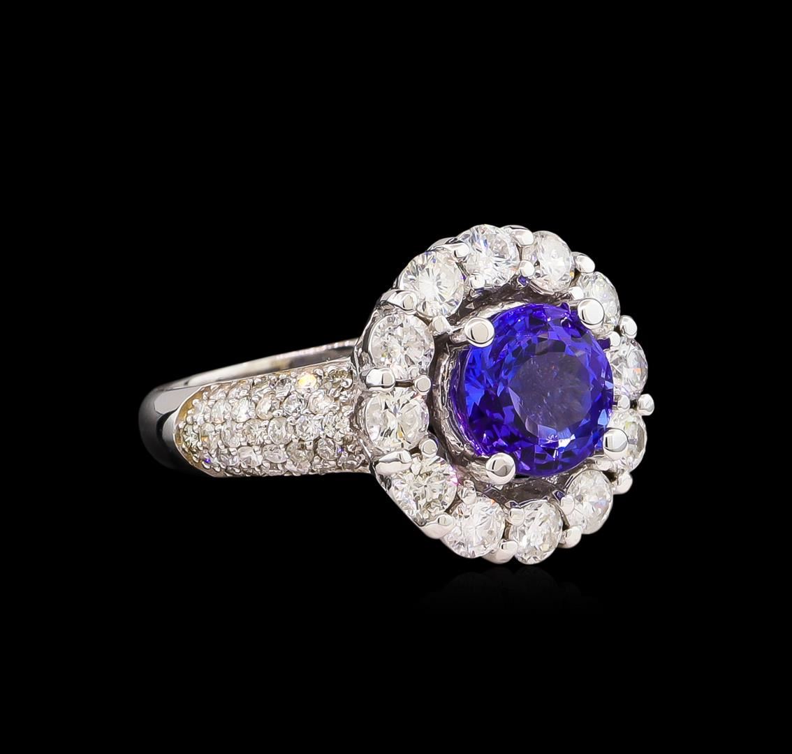 One electronically tested 14KT white gold Ladies combination cast & assembled ring with a bright polish finish. Condition is new. Identified with markings of "K14". Containing: One prong set round modified brilliant cut natural tanzanite, measuring 8.00 - 8.00 x 5.20 mm, approximate weight of 2.23ct., clarity is eye clean, type I, medium, moderately strong, bluish violet color, (GIA bV 5/4), cut is very good. Colored gemstones are presumed to have been subjected to commonly used color/clarity enhancement processes. Twelve prong set round brilliant cut diamonds, measuring 3.00 - 3.00 x 1.80mm (depth est.) approximate. Total Weight of 12 Stones = 1.19ct. Clarity: I-1 to I-2. Color: I - J, Cut is Good. Sixty-Two prong set round brilliant cut diamonds, measuring 1.30 - 1.30 x 0.78mm (depth est.) approximate. Total Weight of 62 Stones = 0.50ct. Clarity: I-1 to I-2. Color: I - J, Cut is Good. Total Weight of Colored Stones 2.23ct. Total Weight of Diamonds 1.68ct. Total Weight of Ring 8.40 grams. GGL Appraised at $9,525.00.