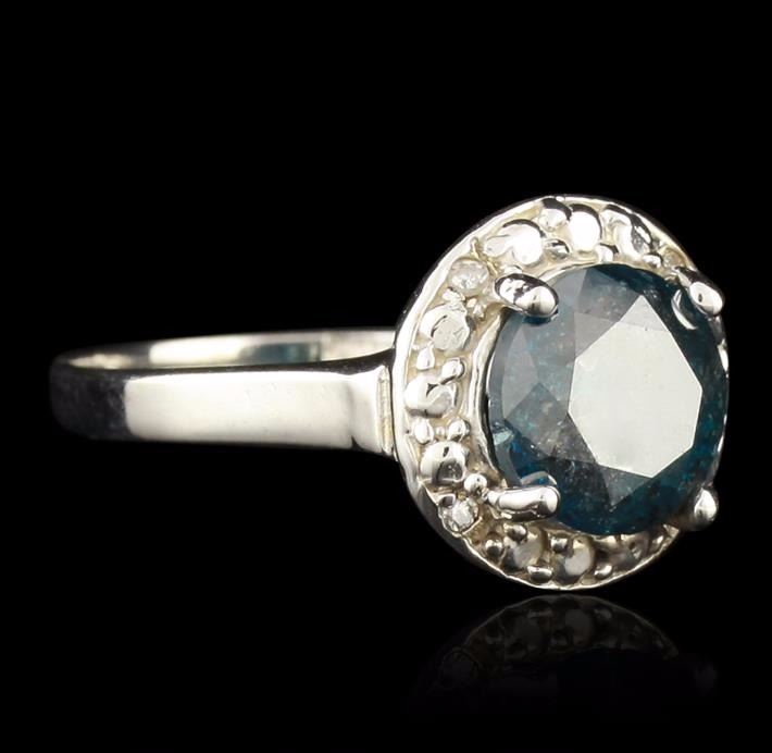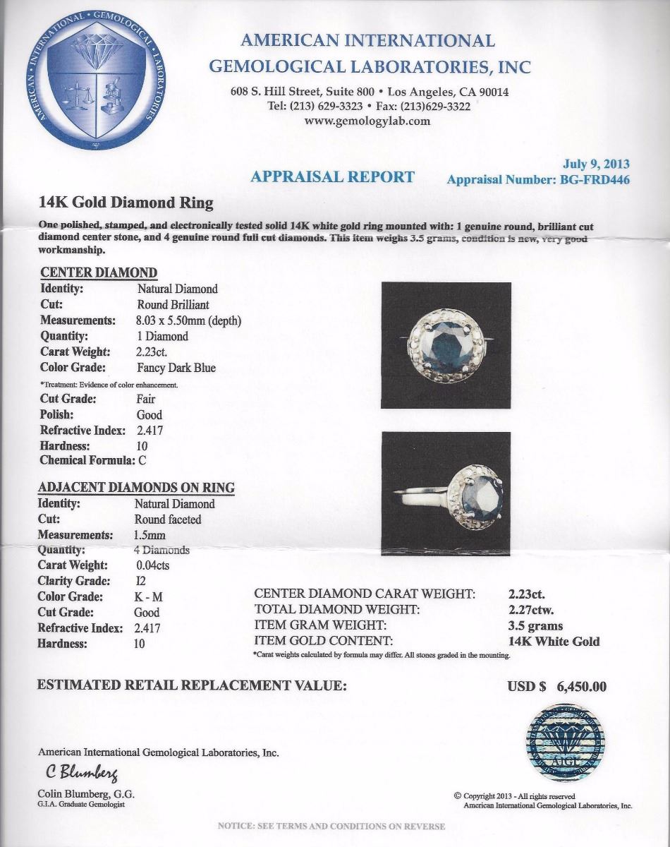 One electronically tested 14KT White Gold 2.23ct Blue Diamond Ring. One polished, stamped, and electronically tested solid 14KT white gold ring featuring: 1 genuine round, brilliant cut diamond center stone with a total weight of 2.23ct, and 4 genuine round full cut diamonds with a total weight of 2.27ctw. This item weighs 3.5 grams, condition is new, very good workmanship. AIG Appraised at $6,450.00.