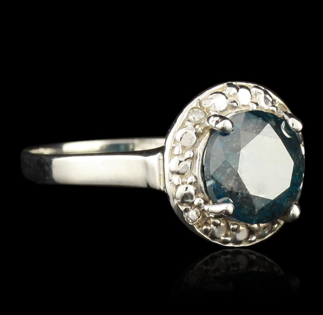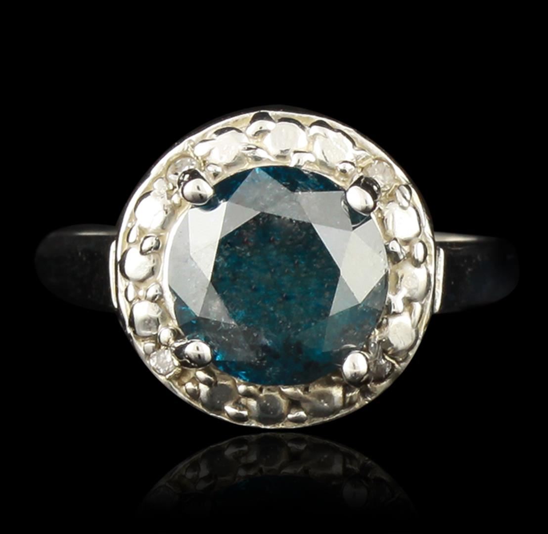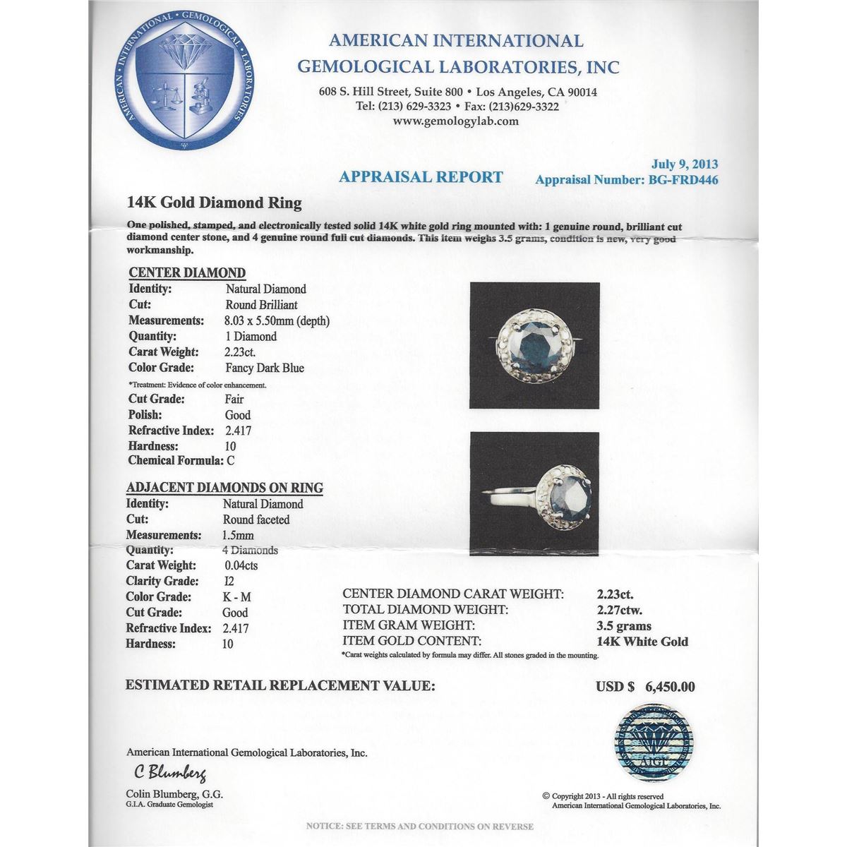 One electronically tested 14KT White Gold 2.23ct Blue Diamond Ring. One polished, stamped, and electronically tested solid 14KT white gold ring featuring: 1 genuine round, brilliant cut diamond center stone with a total weight of 2.23ct, and 4 genuine round full cut diamonds with a total weight of 2.27ctw. This item weighs 3.5 grams, condition is new, very good workmanship. AIG Appraised at $6,450.00.