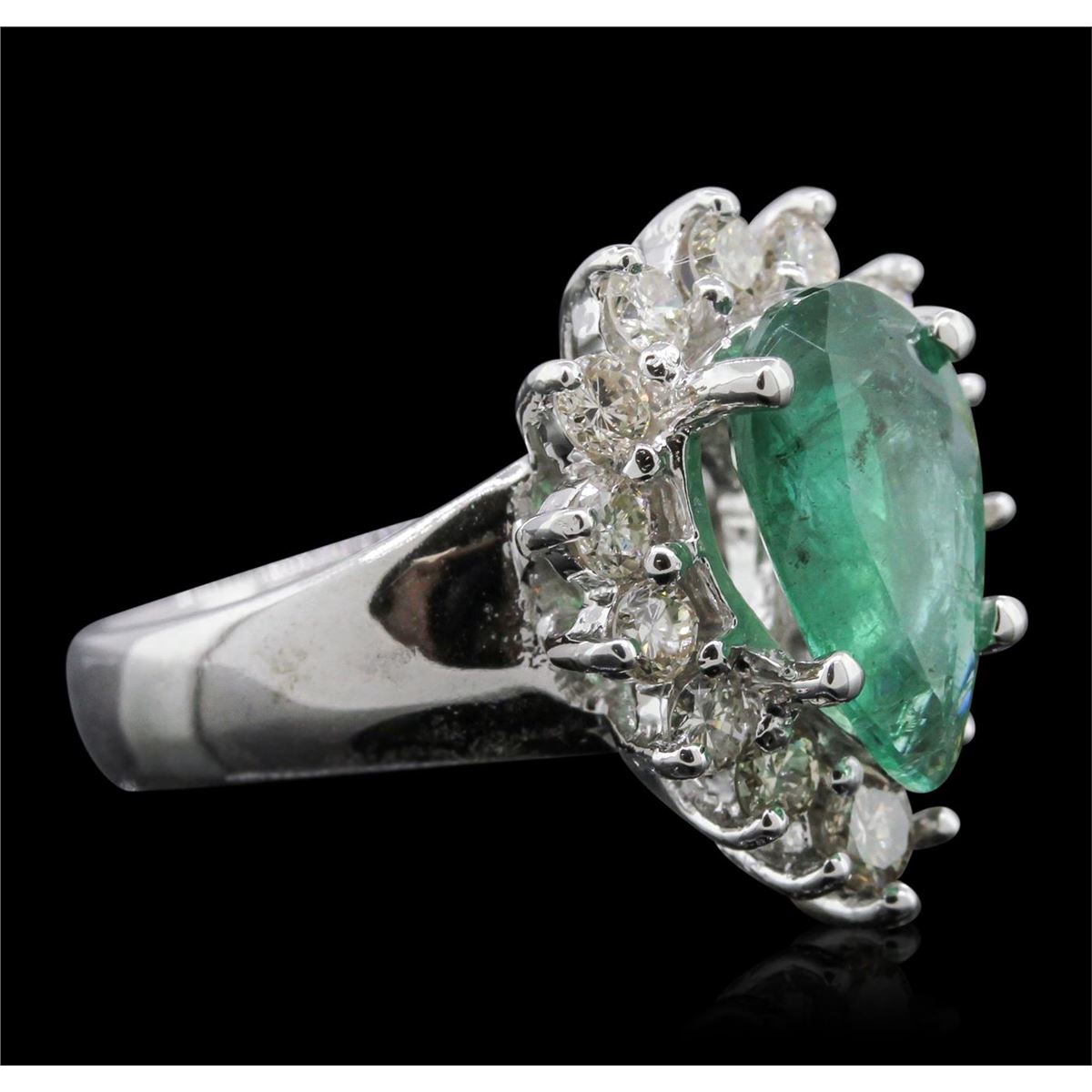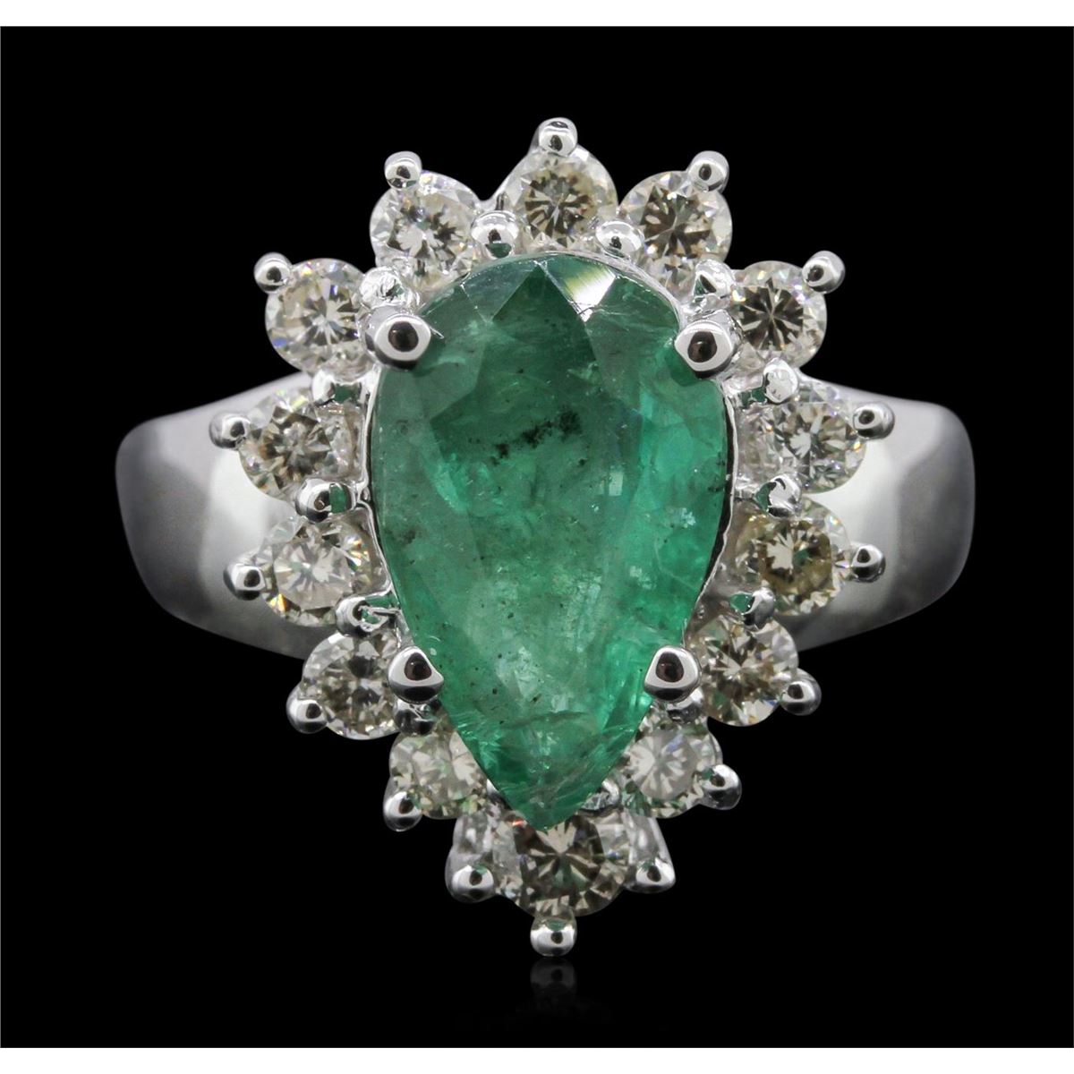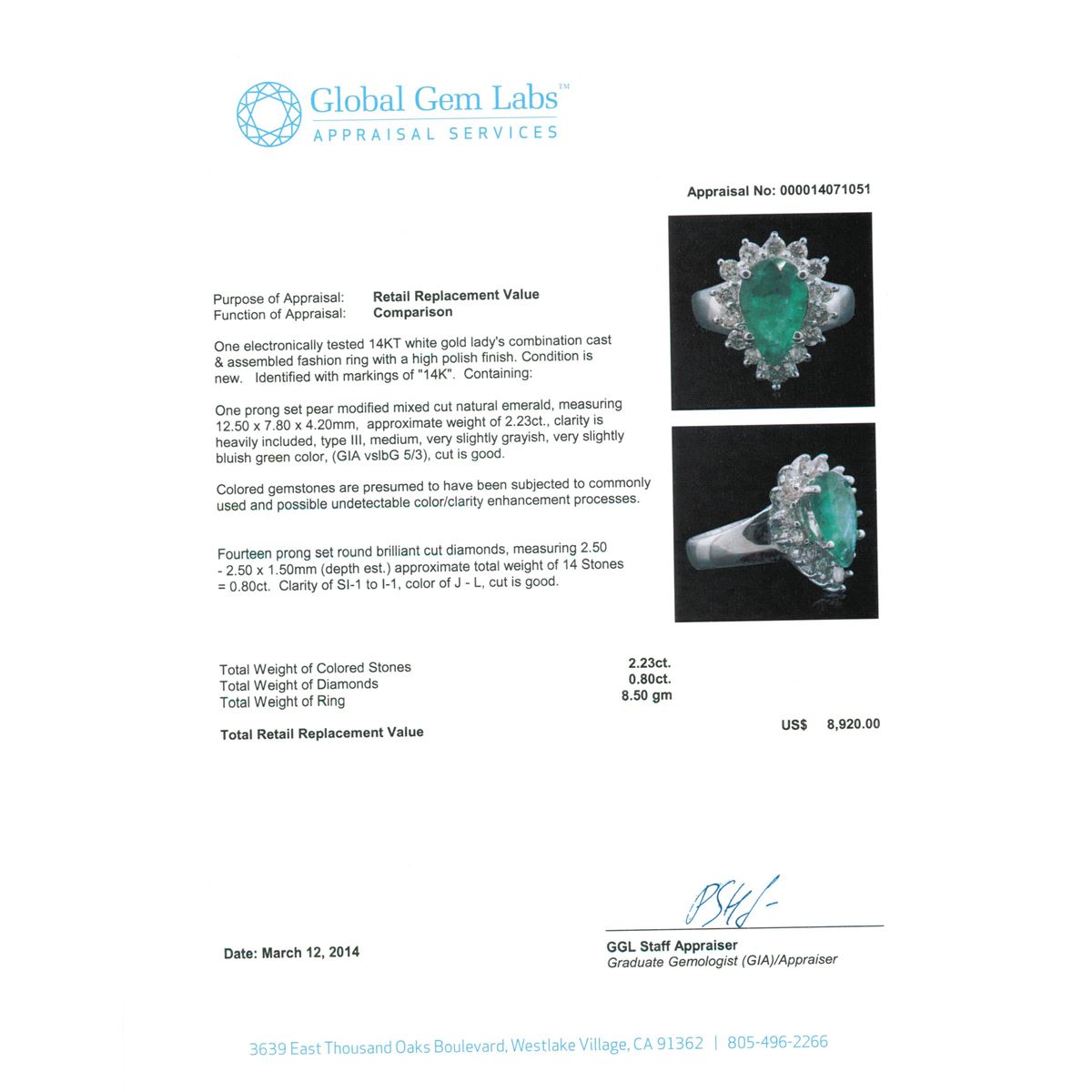 One electronically tested 14KT white gold Ladies combination cast & assembled fashion ring with a high polish finish. Condition is new. Identified with markings of "14K". Containing: One prong set pear modified mixed cut natural emerald, measuring 12.50 x 7.80 x 4.20mm, approximate weight of 2.23ct., clarity is heavily included, type III, medium, very slightly grayish, very slightly bluish green color, (GIA vslbG 5/3), cut is good. Colored gemstones are presumed to have been subjected to commonly used and possible undetectable color/clarity enhancement processes. Fourteen prong set round brilliant cut diamonds, measuring 2.50 - 2.50 x 1.50mm (depth est.) approximate total weight of 14 Stones = 0.80ct. Clarity of SI-1 to I-1, Color of J - L, Cut is Good. Total Weight of Colored Stones 2.23ct. Total Weight of Diamonds 0.80ct. Total Weight of Ring 8.50 grams. GGL Appraised at $8,920.00.
