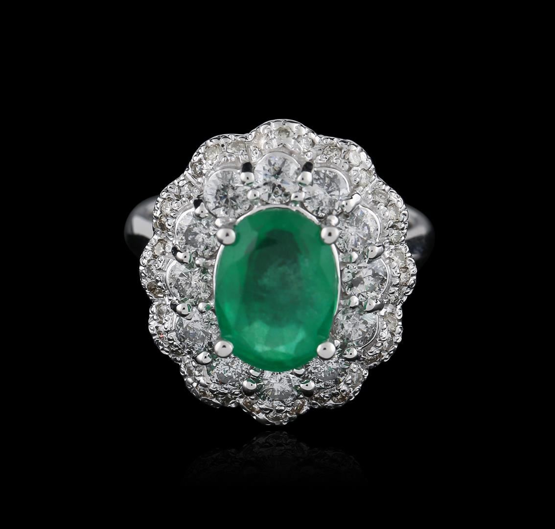 One electronically tested 14KT white gold ladies cast emerald and diamond ring with a cathedral shank with a bright polish finish. Identified with markings of "K14". Condition is new. Containing: One prong set oval modified brilliant cut natural emerald, measuring 10.33 x 7.57 x 5.00mm, approximate weight of 2.23ct., clarity is heavily included, type III, medium light, very slightly grayish, very slightly bluish green color, (GIA vslbG 4/3), cut is good. Twelve prong set round brilliant cut diamonds, measuring 2.90 - 2.90 x 1.74mm (depth est.) approximate total weight of 12 Stones = 1.07ct. Clarity: I-1 to I-3. Color: I - J, Cut is Good. Thirty-Six prong set round brilliant cut diamonds, measuring 1.20 - 1.20 x 0.72mm (depth est.) approximate total weight of 36 Stones = 0.23ct. Clarity: SI-1 to SI-2. Color: J - K, Cut is Good. All diamonds and colored gemstones are graded in the mounting, unless otherwise stated. Colored gemstones are presumed to have been subjected to commonly used enhancement processes.. Total Weight of Colored Stones 2.23ct. Total Weight of Diamonds 1.30ct. Total Weight of Ring 8.00 grams. GGL Appraised at $4,450.00.