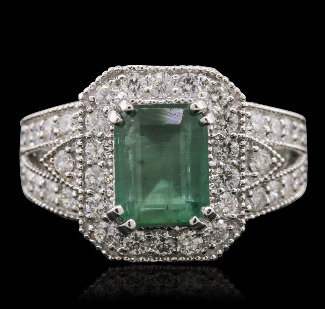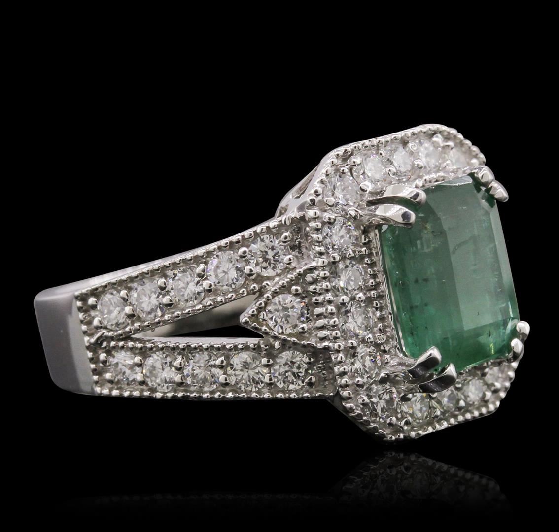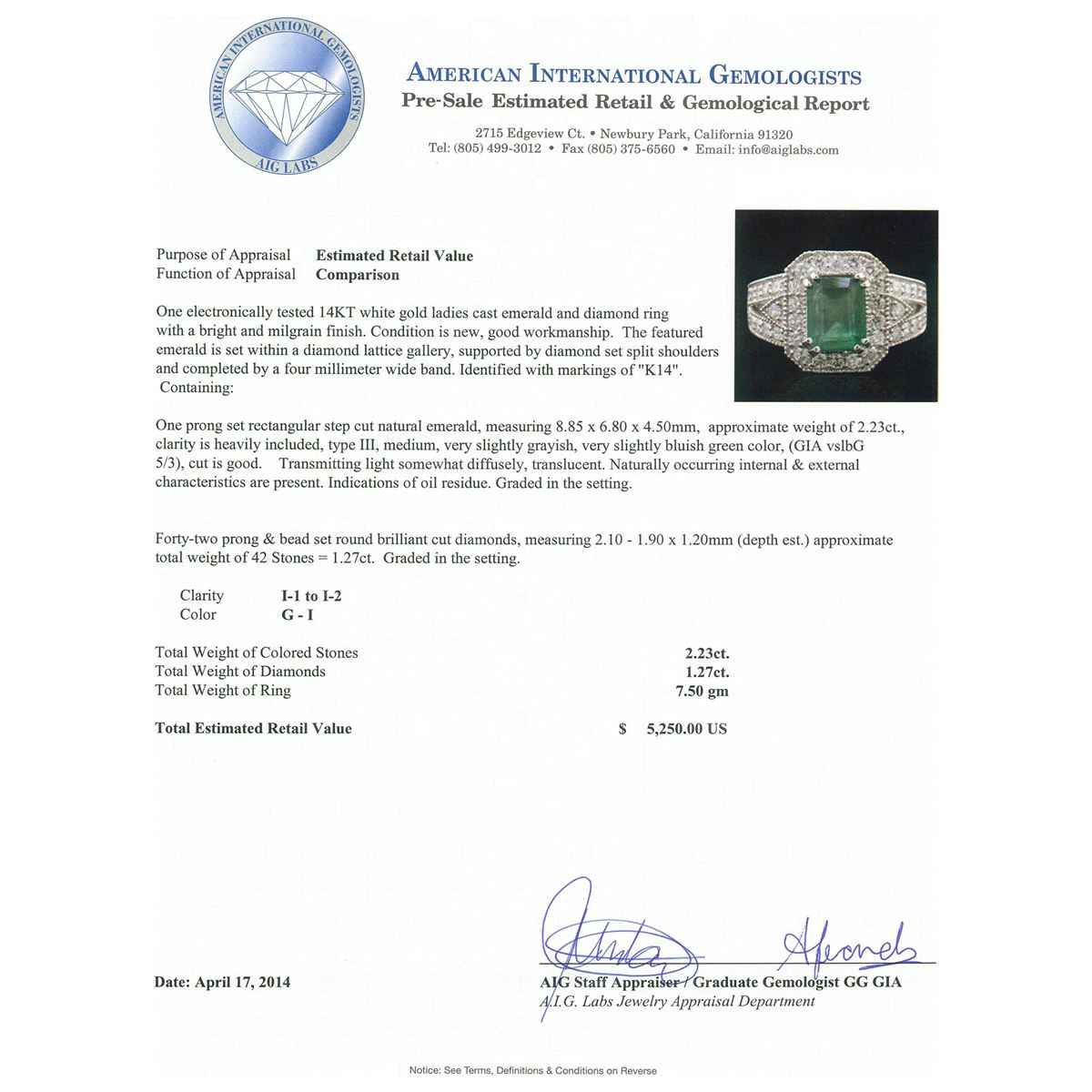 One electronically tested 14KT white gold ladies cast emerald and diamond ring with a bright and milgrain finish. Condition is new, good workmanship. The featured emerald is set within a diamond lattice gallery, supported by diamond set split shoulders and completed by a four millimeter wide band. Identified with markings of "K14". Containing: One prong set rectangular step cut natural emerald, measuring 8.85 x 6.80 x 4.50mm, approximate weight of 2.23ct., clarity is heavily included, type III, medium, very slightly grayish, very slightly bluish green color, (GIA vslbG 5/3), cut is good. Transmitting light somewhat diffusely, translucent. Naturally occurring internal & external characteristics are present. Indications of oil residue. Graded in the setting. Forty-Two prong & bead set round brilliant cut diamonds, measuring 2.10 - 1.90 x 1.20mm (depth est.) approximate. Total Weight of 42 Stones = 1.27ct. Graded in the setting. Clarity: I-1 to I-2. Color: G - I. Total Weight of Colored Stones 2.23ct. Total Weight of Diamonds 1.27ct. Total Weight of Ring 7.50 grams. AIG Appraised at $5,250.00.