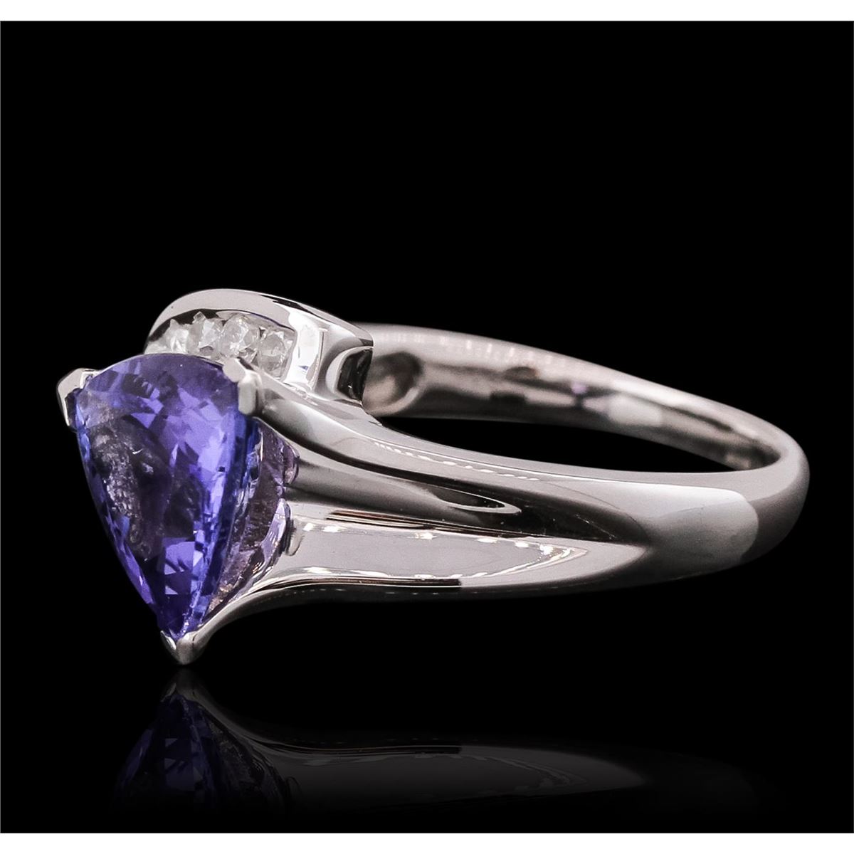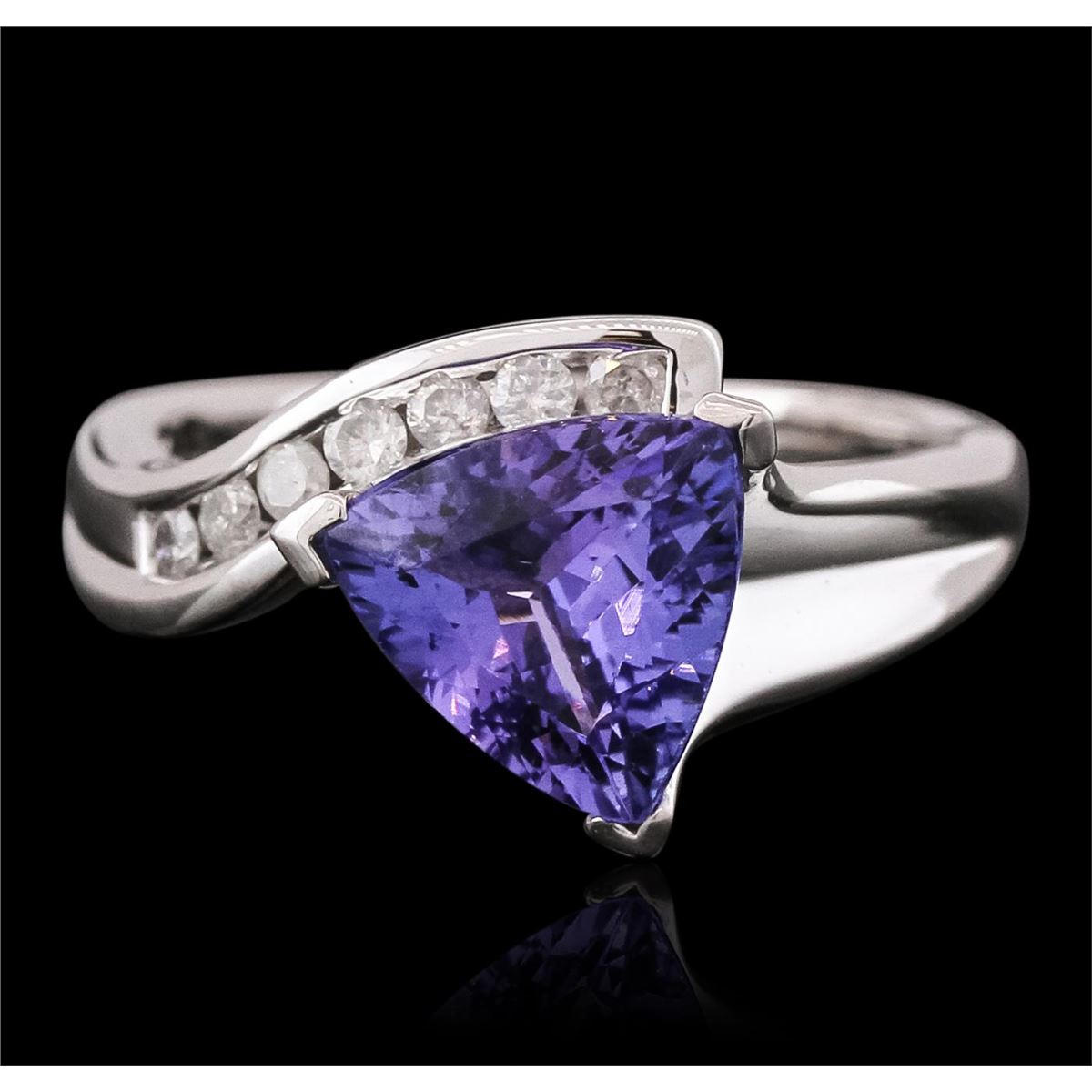 One electronically tested 14KT white gold ladies cast tanzanite and diamond ring with a bright polish finish. The featured tanzanite is supported by a diamond ribbon, completed by a two millimeter wide band. Trademark is Orianne. Identified with markings of "14K". Condition is new, good workmanship. Containing: One prong set triangle brilliant cut natural tanzanite, measuring 9.00 x 8.80 x 4.40mm, 6% bulge factor, approximate weight of 2.23ct., clarity is slightly included, type I, medium dark, very slightly grayish, bluish violet color, (GIA bV 6/3), cut is good. Transmitting light with a minimum of distortion, transparent. Graded in the setting. Tanzanite is a very rare gemstone that is only found in the country of Tanzania. Originally discovered in 1967. Tiffany & Company, named the stone Tanzanite. It is found in the Usumburu Mountains that border the Umba Valley of northern Tanzania. Tanzanite occurs in gray, brown, violet, blue, reddish-purple, & green. The gem is interesting because of its exceptional pleochroism. Rotated in different directions a tanzanite will exhibit multiple changes of color. Tanzanite has a low tolerance to ultrasonic cleaning, and should not be cleaned using this method. Seven prong set round brilliant cut diamonds, measuring 1.90 - 1.80 x 1.11mm (depth est.) approximate total weight of 7 Stones = 0.26ct. Graded in the setting. Clarity: I-2 to I-3. Color: H - J. Total Weight of Colored Stones 2.23ct. Total Weight of Diamonds 0.26ct. Total Weight of Ring 4.46 grams. AIG Appraised at $6,135.00.