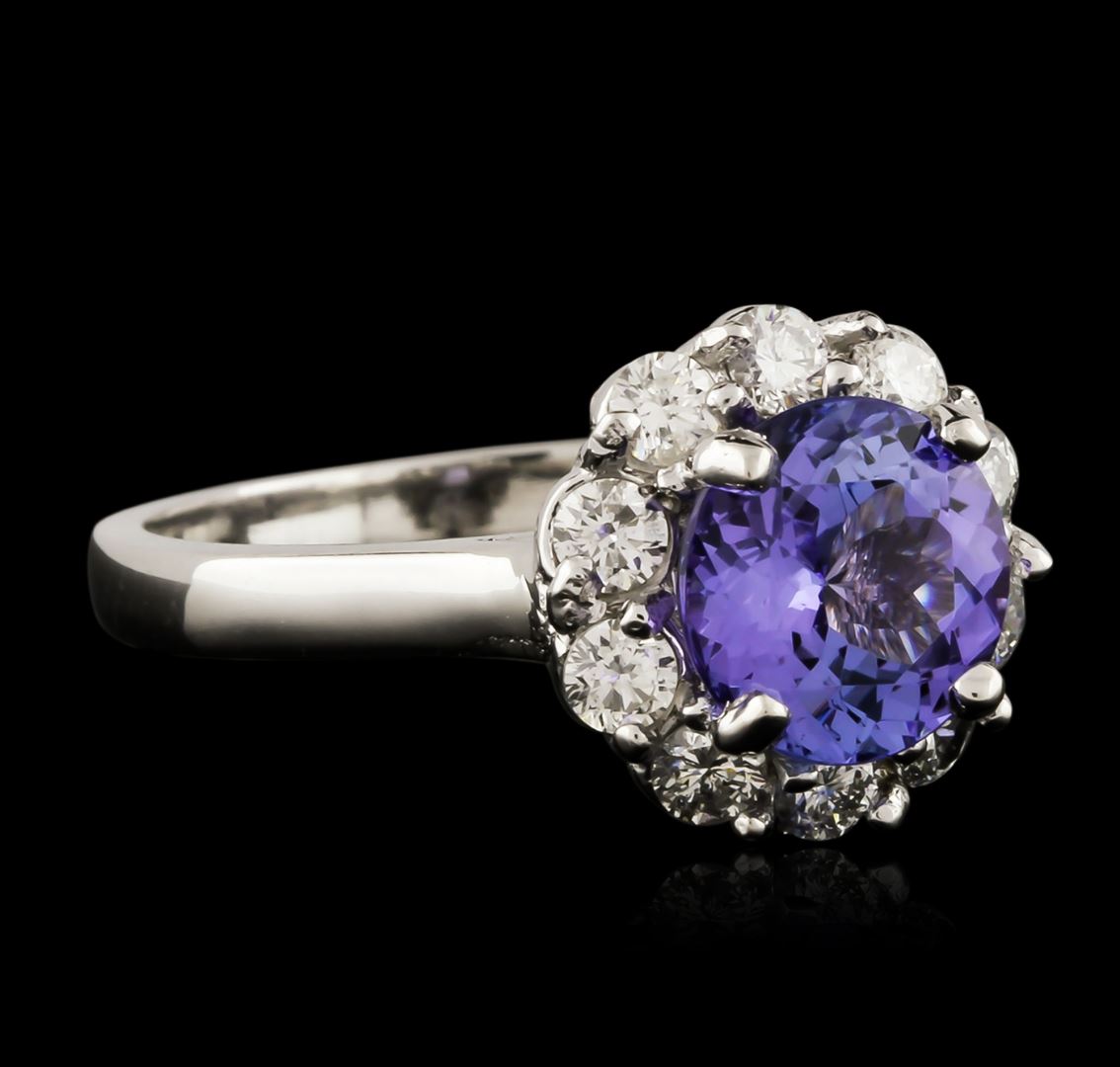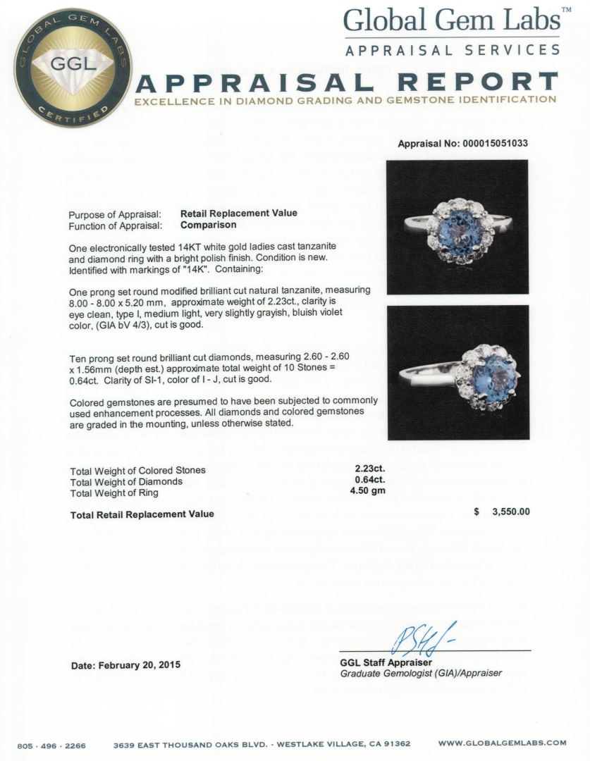 One electronically tested 14KT white gold ladies cast tanzanite and diamond ring with a bright polish finish. Identified with markings of "14K". Condition is new. Containing: One prong set round modified brilliant cut natural tanzanite, measuring 8.00 - 8.00 x 5.20 mm, approximate weight of 2.23ct., clarity is eye clean, type I, medium light, very slightly grayish, bluish violet color, (GIA bV 4/3), cut is good. Ten prong set round brilliant cut diamonds, measuring 2.60 - 2.60 x 1.56mm (depth est.) approximate total weight of 10 Stones = 0.64ct. Clarity: SI-1. Color: I - J, Cut is Good. Colored gemstones are presumed to have been subjected to commonly used enhancement processes. All diamonds and colored gemstones are graded in the mounting, unless otherwise stated. Total Weight of Colored Stones 2.23ct. Total Weight of Diamonds 0.64ct. Total Weight of Ring 4.50 grams. GGL Appraised at $3,550.00.