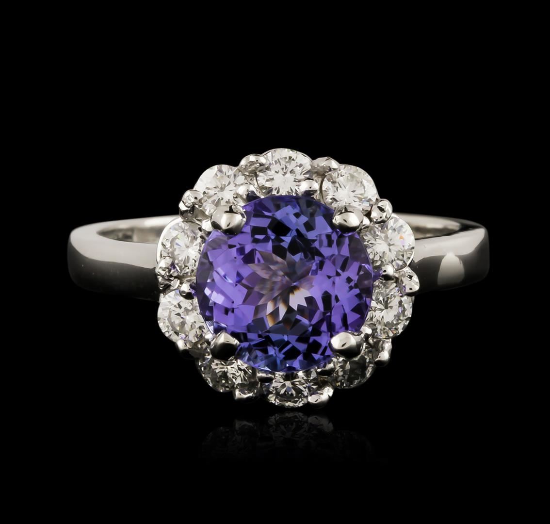 One electronically tested 14KT white gold ladies cast tanzanite and diamond ring with a bright polish finish. Identified with markings of "14K". Condition is new. Containing: One prong set round modified brilliant cut natural tanzanite, measuring 8.00 - 8.00 x 5.20 mm, approximate weight of 2.23ct., clarity is eye clean, type I, medium light, very slightly grayish, bluish violet color, (GIA bV 4/3), cut is good. Ten prong set round brilliant cut diamonds, measuring 2.60 - 2.60 x 1.56mm (depth est.) approximate total weight of 10 Stones = 0.64ct. Clarity: SI-1. Color: I - J, Cut is Good. Colored gemstones are presumed to have been subjected to commonly used enhancement processes. All diamonds and colored gemstones are graded in the mounting, unless otherwise stated. Total Weight of Colored Stones 2.23ct. Total Weight of Diamonds 0.64ct. Total Weight of Ring 4.50 grams. GGL Appraised at $3,550.00.