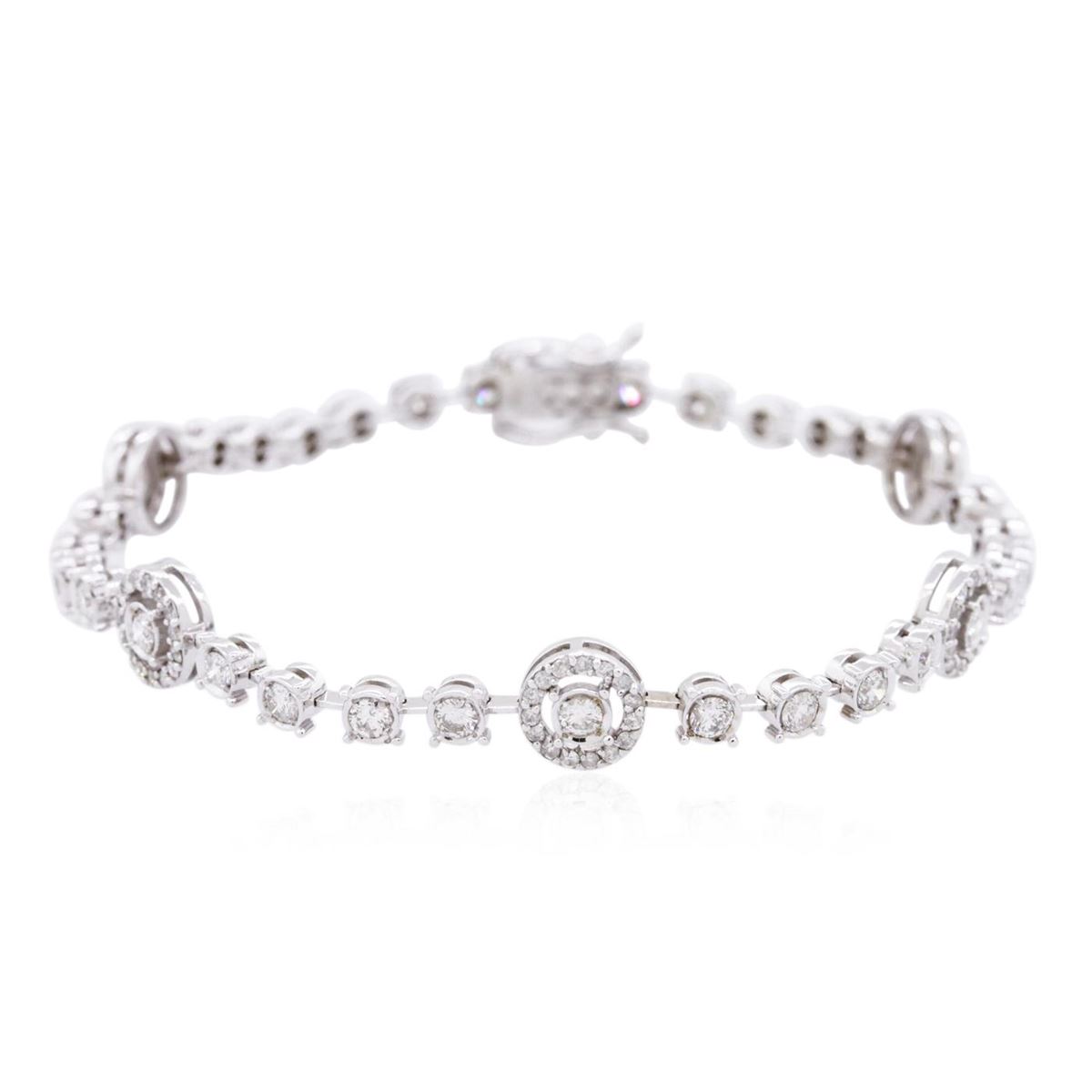 One electronically tested 14KT white gold ladies cast diamond bracelet with a hidden box clasp with safety closer with a bright polish finish. Measurements: 7" in length Identified with markings of "14K". Condition is new. Containing: Thirty-Three prong set round brilliant cut diamonds, measuring 2.50 - 2.50 x 1.50mm (depth est.) approximate total weight of 33 Stones = 1.88ct. Clarity: SI-1 to SI-2. Color: I - J, Cut is Good. Ninety-Six prong set round brilliant cut diamonds, measuring 1.00 - 1.00 x 0.60mm (depth est.) approximate total weight of 96 Stones = 0.35ct. Clarity: I-1 to I-2. Color: I - J, Cut is Good. All diamonds are graded in the mounting, unless otherwise stated. Total Weight of Diamonds 2.23ct. Total Weight of Bracelet 9.00 grams. GGL Appraised at $11,920.00.