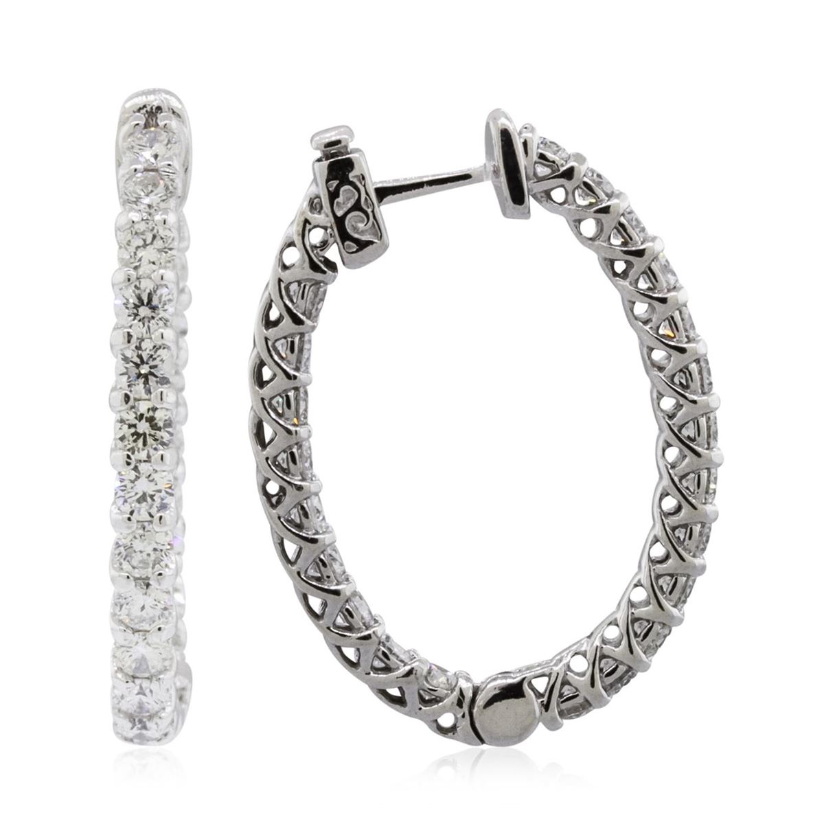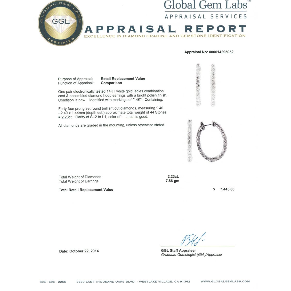 One pair electronically tested 14KT white gold ladies combination cast & assembled diamond hoop earrings with a bright polish finish. Identified with markings of "14K". Condition is new. Containing: Forty-Four prong set round brilliant cut diamonds, measuring 2.40 - 2.40 x 1.44mm (depth est.) approximate total weight of 44 Stones = 2.23ct. Clarity: SI-2 to I-1. Color: I - J, Cut is Good. All diamonds are graded in the mounting, unless otherwise stated. Total Weight of Diamonds 2.23ct. Total Weight of Earrings 7.86 grams. GGL Appraised at $7,445.00.