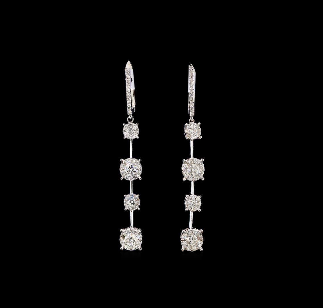 One pair electronically tested 14KT white gold ladies cast diamond earrings with hinged clip backs with a bright polish finish. Identified with markings of "K14". Condition is new. Containing: Four prong set round brilliant cut diamonds, measuring 3.50 - 3.50 x 2.10mm (depth est.) approximate total weight of 4 Stones = 0.63ct. Clarity: I-1 to I-2. Color: F - G, Cut is Good. Four prong set round brilliant cut diamonds, measuring 2.50 - 2.50 x 1.50mm (depth est.) approximate total weight of 4 Stones = 0.23ct. Clarity: I-1 to I-2. Color: F - G, Cut is Good. Sixty-Four prong set round brilliant cut diamonds, measuring 2.00 - 1.50 x 1.05mm (depth est.) approximate total weight of 64 Stones = 1.25ct. Clarity: SI-2 to I-2. Color: H - I, Cut is Good. Twenty prong set round brilliant cut diamonds, measuring 1.20 - 1.20 x 0.72mm (depth est.) approximate total weight of 20 Stones = 0.13ct. Clarity: I-1 to I-2. Color: H - I, Cut is Good. All diamonds are graded in the mounting, unless otherwise stated. Total Weight of Diamonds 2.24ct. Total Weight of Earrings 6.50 grams. GGL Appraised at $5,370.00.