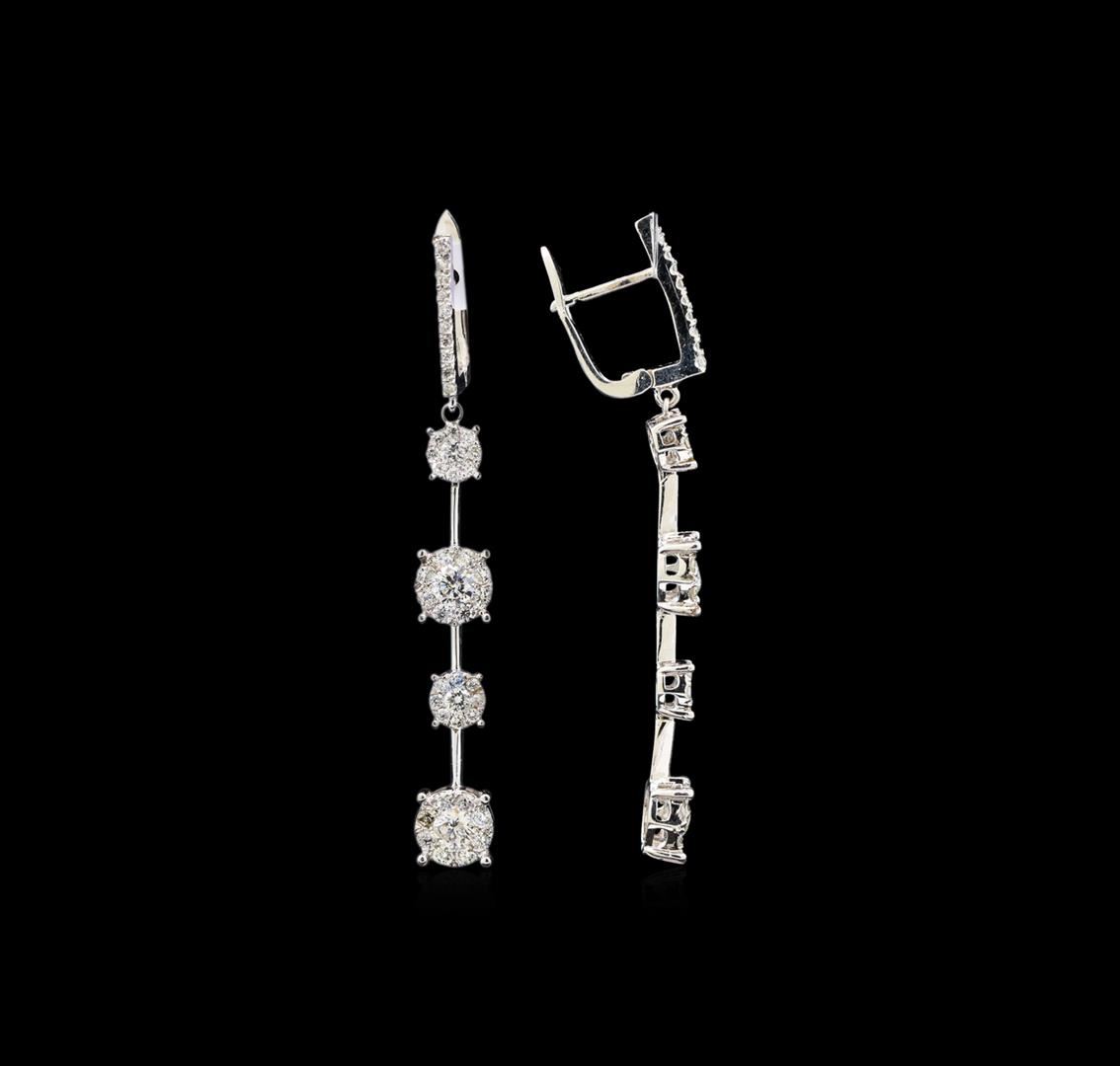 One pair electronically tested 14KT white gold ladies cast diamond earrings with hinged clip backs with a bright polish finish. Identified with markings of "K14". Condition is new. Containing: Four prong set round brilliant cut diamonds, measuring 3.50 - 3.50 x 2.10mm (depth est.) approximate total weight of 4 Stones = 0.63ct. Clarity: I-1 to I-2. Color: F - G, Cut is Good. Four prong set round brilliant cut diamonds, measuring 2.50 - 2.50 x 1.50mm (depth est.) approximate total weight of 4 Stones = 0.23ct. Clarity: I-1 to I-2. Color: F - G, Cut is Good. Sixty-Four prong set round brilliant cut diamonds, measuring 2.00 - 1.50 x 1.05mm (depth est.) approximate total weight of 64 Stones = 1.25ct. Clarity: SI-2 to I-2. Color: H - I, Cut is Good. Twenty prong set round brilliant cut diamonds, measuring 1.20 - 1.20 x 0.72mm (depth est.) approximate total weight of 20 Stones = 0.13ct. Clarity: I-1 to I-2. Color: H - I, Cut is Good. All diamonds are graded in the mounting, unless otherwise stated. Total Weight of Diamonds 2.24ct. Total Weight of Earrings 6.50 grams. GGL Appraised at $5,370.00.