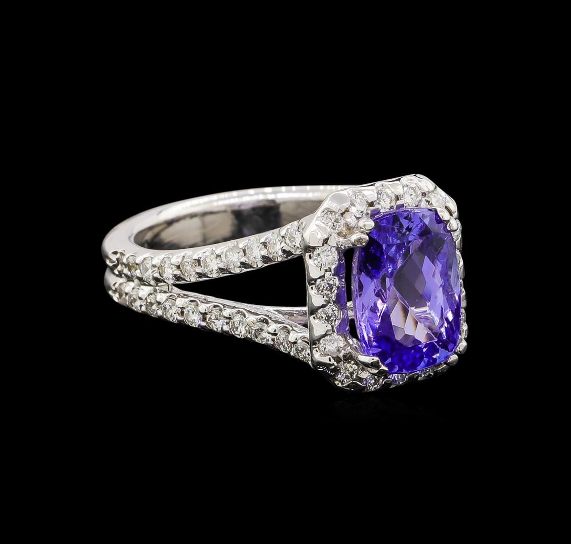 One electronically tested 14KT white gold ladies cast tanzanite and diamond ring with a bright polish finish. Identified with markings of "K14". Condition is new. Containing: One prong set rectangular cushion modified brilliant cut natural tanzanite, measuring 10.00 x 6.50 x 4.38mm, approximate weight of 2.24ct., clarity is eye clean, type I, medium light, very slightly grayish, violet color, (GIA V 4/3), cut is good. Fifty-Four prong set round brilliant cut diamonds, measuring 1.50 - 1.50 x 0.90mm (depth est.) approximate total weight of 54 Stones = 0.66ct. Clarity: SI-2 to I-2. Color: I - J, Cut is Good. Colored gemstones are presumed to have been subjected to commonly used enhancement processes. All diamonds and colored gemstones are graded in the mounting, unless otherwise stated. Total Weight of Colored Stones 2.24ct. Total Weight of Diamonds 0.66ct. Total Weight of Ring 7.60 grams. GGL Appraised at $4,975.00.