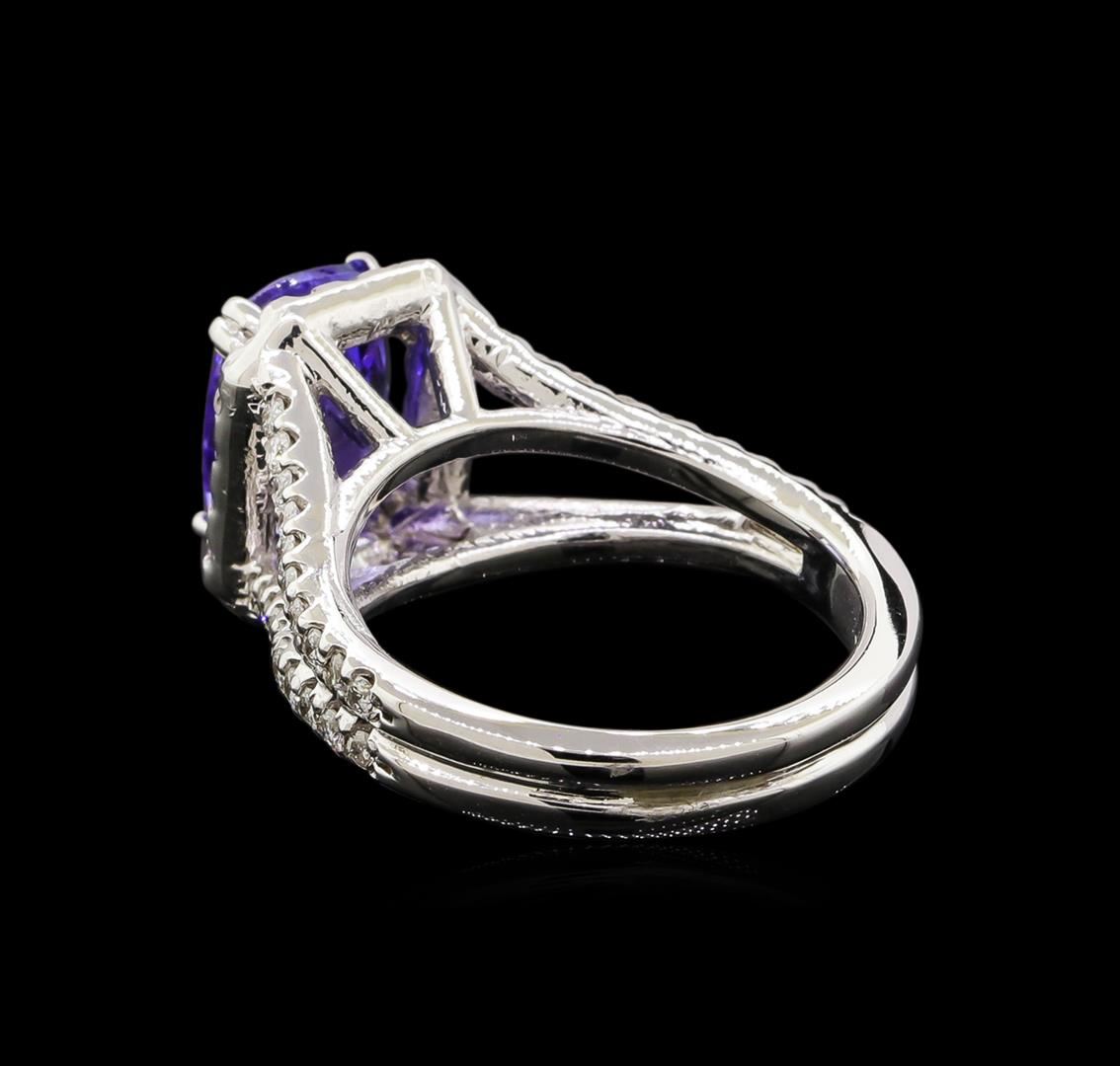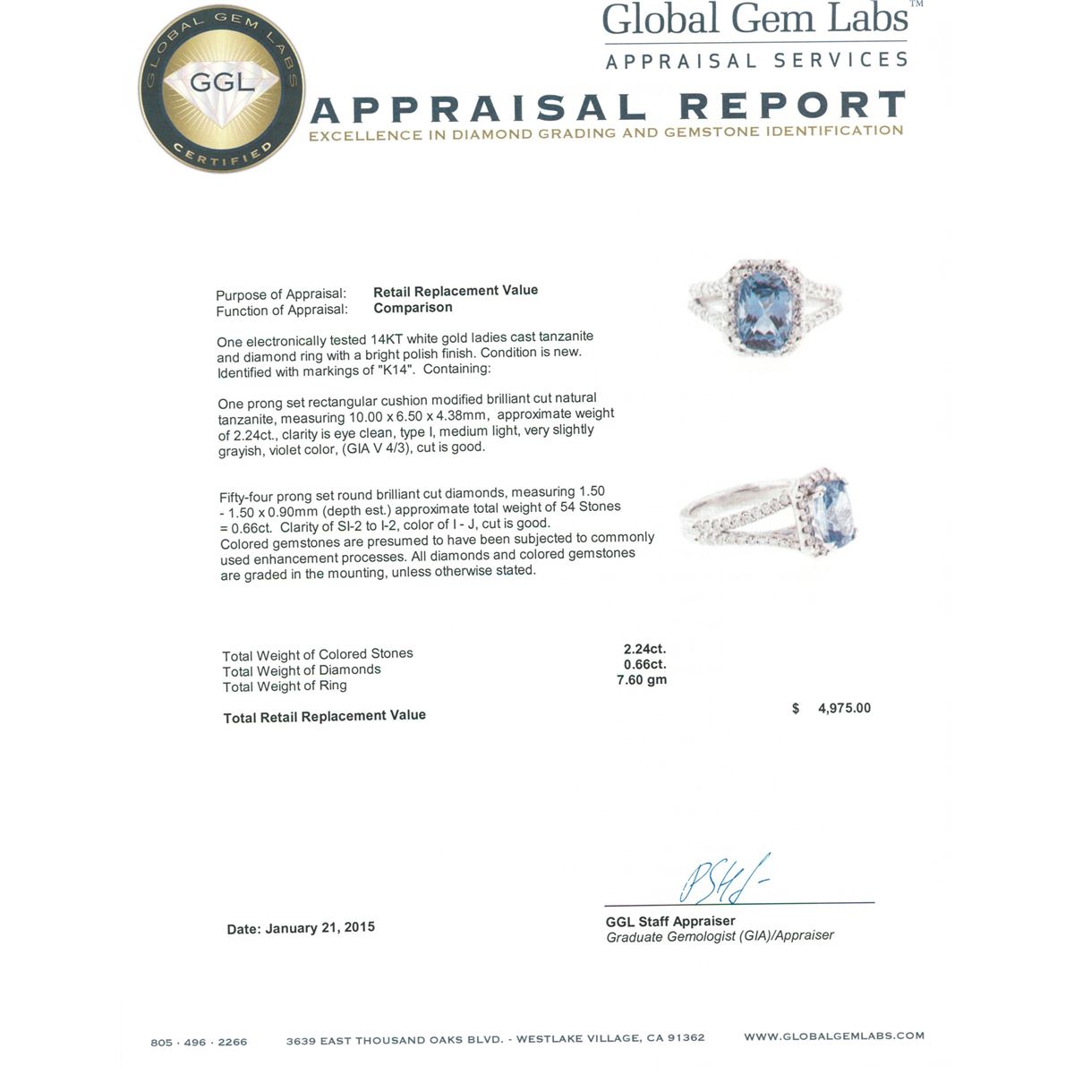 One electronically tested 14KT white gold ladies cast tanzanite and diamond ring with a bright polish finish. Identified with markings of "K14". Condition is new. Containing: One prong set rectangular cushion modified brilliant cut natural tanzanite, measuring 10.00 x 6.50 x 4.38mm, approximate weight of 2.24ct., clarity is eye clean, type I, medium light, very slightly grayish, violet color, (GIA V 4/3), cut is good. Fifty-Four prong set round brilliant cut diamonds, measuring 1.50 - 1.50 x 0.90mm (depth est.) approximate total weight of 54 Stones = 0.66ct. Clarity: SI-2 to I-2. Color: I - J, Cut is Good. Colored gemstones are presumed to have been subjected to commonly used enhancement processes. All diamonds and colored gemstones are graded in the mounting, unless otherwise stated. Total Weight of Colored Stones 2.24ct. Total Weight of Diamonds 0.66ct. Total Weight of Ring 7.60 grams. GGL Appraised at $4,975.00.