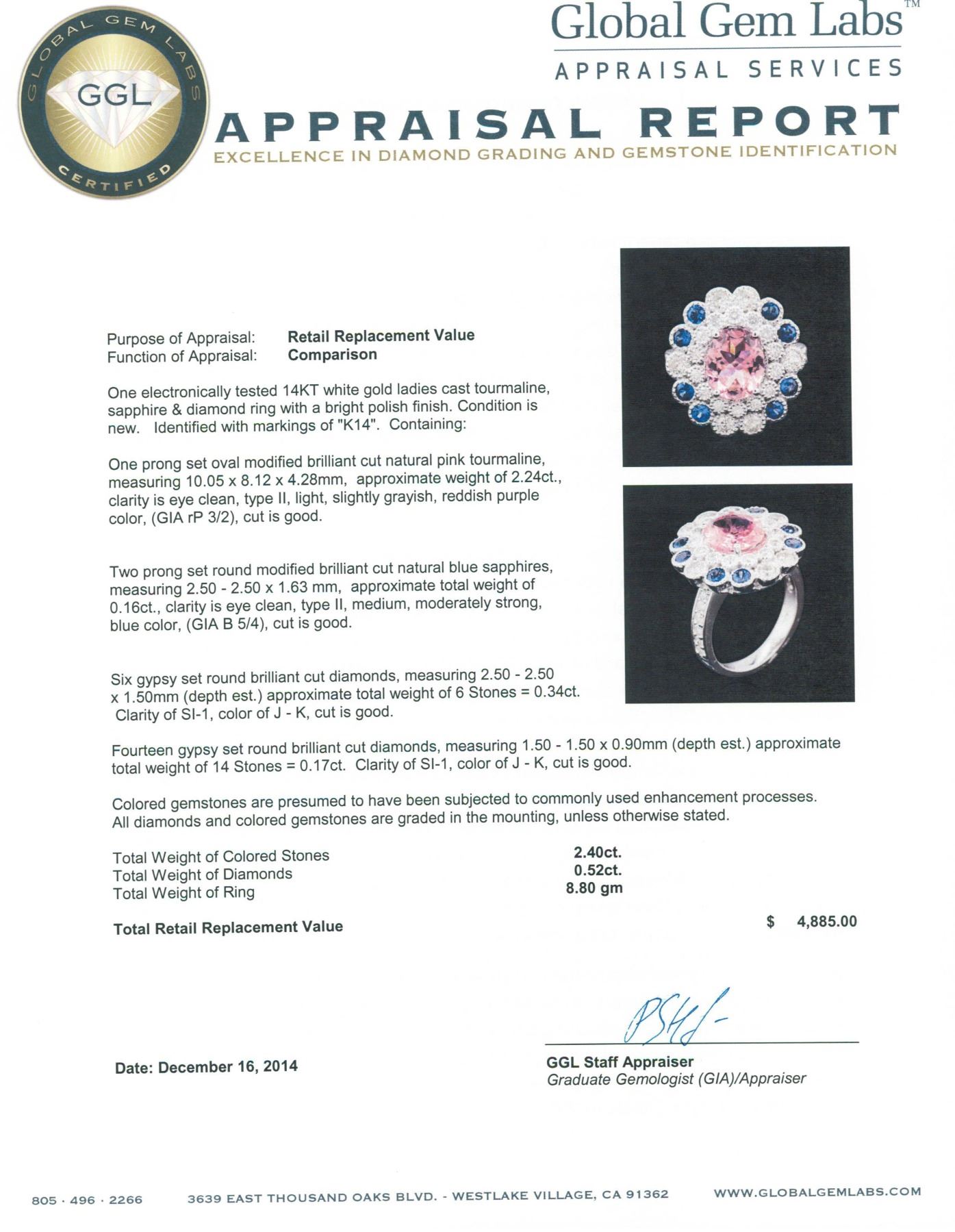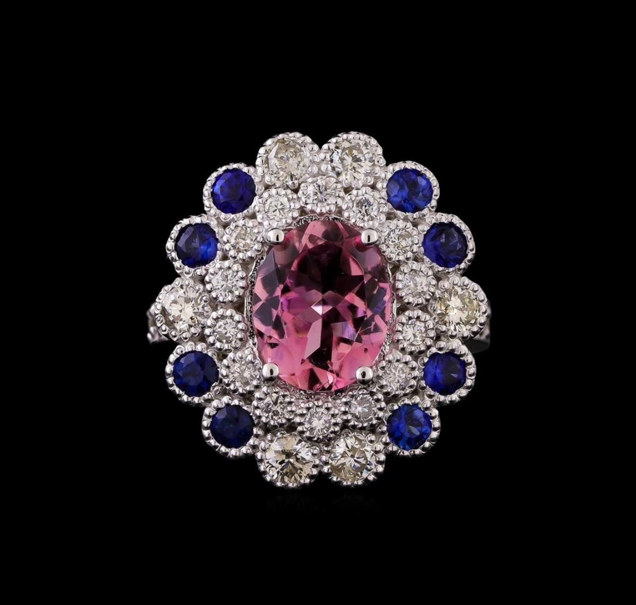 One electronically tested 14KT white gold ladies cast tourmaline, sapphire & diamond ring with a bright polish finish. Identified with markings of "K14". Condition is new. Containing: One prong set oval modified brilliant cut natural pink tourmaline, measuring 10.05 x 8.12 x 4.28mm, approximate weight of 2.24ct., clarity is eye clean, type II, light, slightly grayish, reddish purple color, (GIA rP 3/2), cut is good. Two prong set round modified brilliant cut natural blue sapphires, measuring 2.50 - 2.50 x 1.63 mm, approximate total weight of 0.16ct., clarity is eye clean, type II, medium, moderately strong, blue color, (GIA B 5/4), cut is good. Six gypsy set round brilliant cut diamonds, measuring 2.50 - 2.50 x 1.50mm (depth est.) approximate total weight of 6 Stones = 0.34ct. Clarity: SI-1. Color: J - K, Cut is Good. Fourteen gypsy set round brilliant cut diamonds, measuring 1.50 - 1.50 x 0.90mm (depth est.) approximate total weight of 14 Stones = 0.17ct. Clarity: SI-1. Color: J - K, Cut is Good. Colored gemstones are presumed to have been subjected to commonly used enhancement processes. All diamonds and colored gemstones are graded in the mounting, unless otherwise stated. Total Weight of Colored Stones 2.40 ct. Total Weight of Diamonds 0.52ct. Total Weight of Ring 8.80 grams. GGL Appraised.