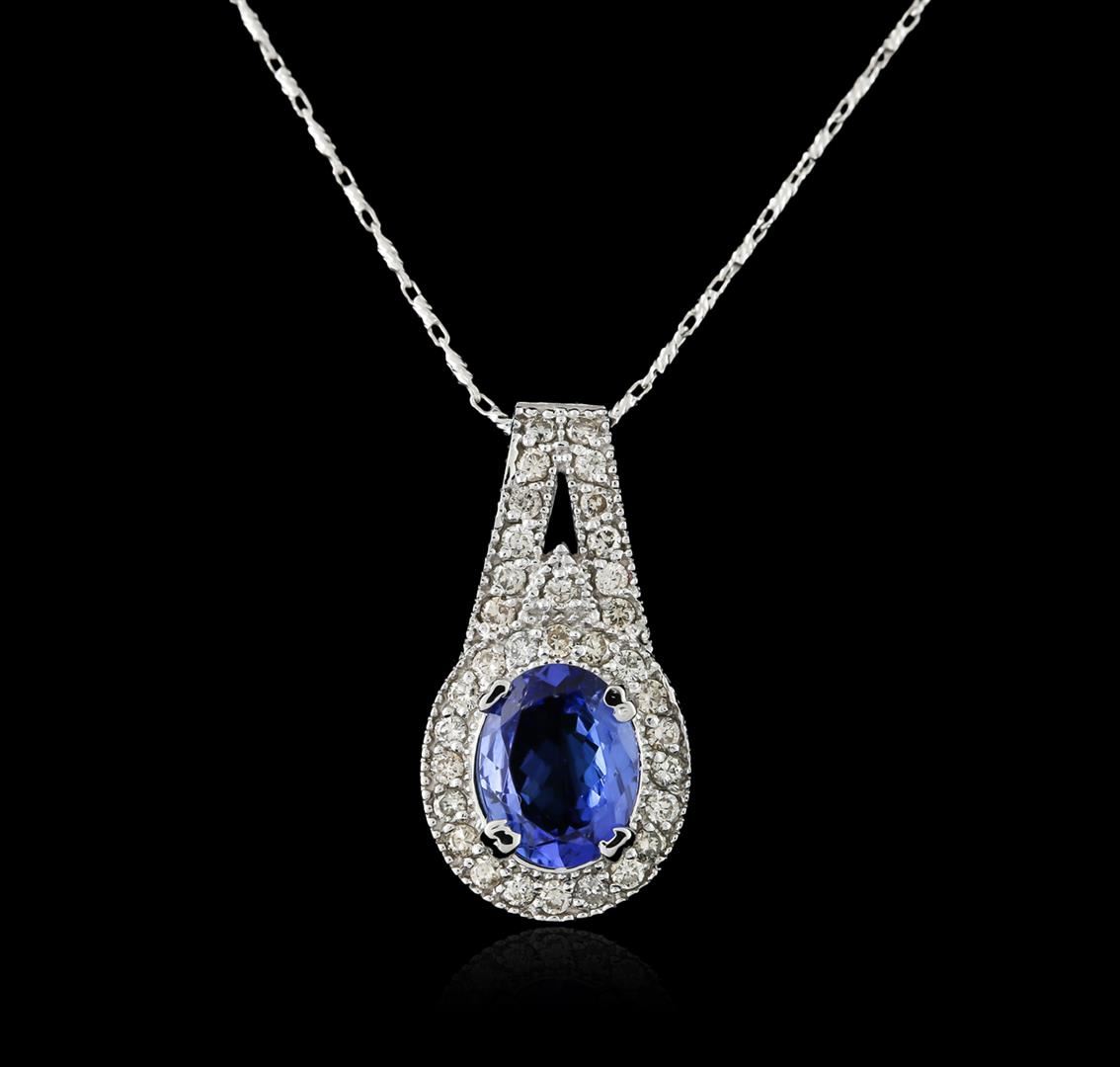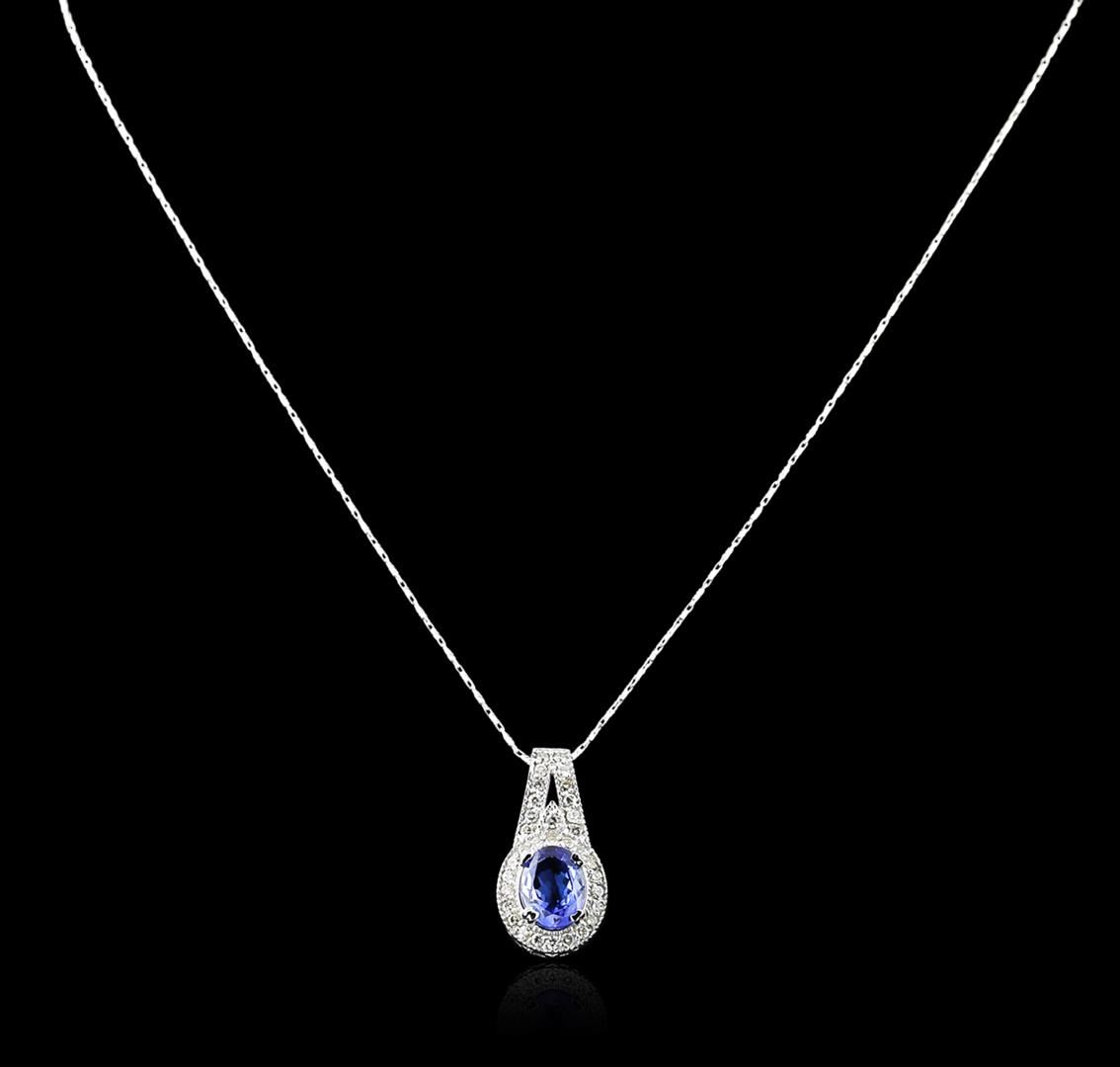 One electronically tested 14KT white gold ladies combination cast & assembled tanzanite and diamond pendant & chain 18.0" long, thin with a lobster claw clasp with a bright polish finish. Identified with markings of "14K". Condition is new. Containing: One prong set oval modified brilliant cut natural tanzanite, measuring 9.00 x 7.00 x 5.06mm, approximate weight of 2.24ct., clarity is eye clean, type I, medium, moderately strong, violet color, (GIA V 5/4), cut is good. Thirty-Three prong set round brilliant cut diamonds, measuring 1.50 - 1.50 x 0.90mm (depth est.) approximate total weight of 33 Stones = 0.41ct. Clarity: SI-1 to SI-2. Color: I - J, Cut is Good. Diamonds and colored gemstones are graded in the mounting, unless otherwise stated. Colored gemstones are presumed to have been subjected to commonly used enhancement processes. Total Weight of Colored Stones 2.24ct. Total Weight of Diamonds 0.41ct. Total Weight of Pendant & Chain 5.60 grams. GGL Appraised at $3,175.00.